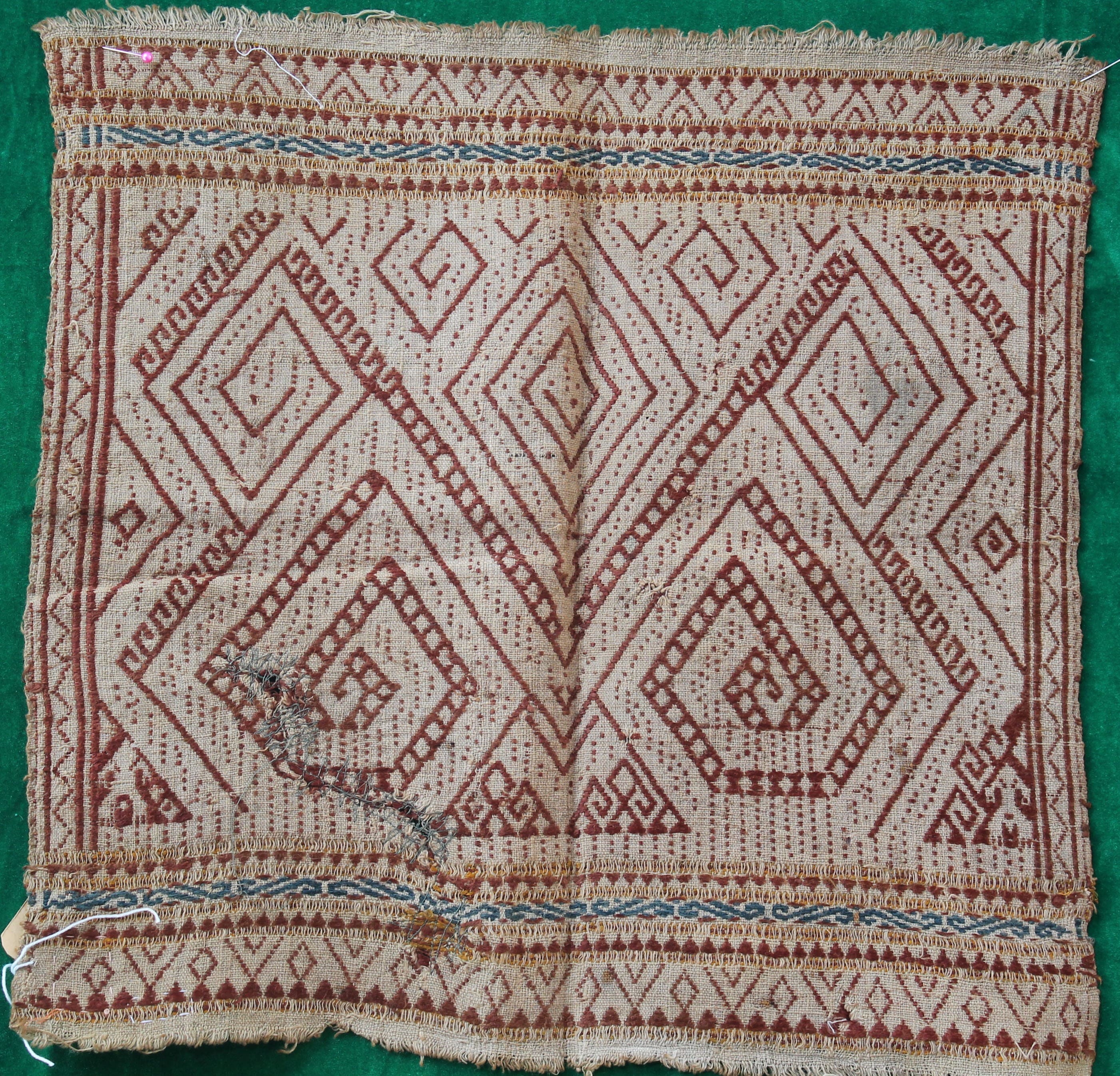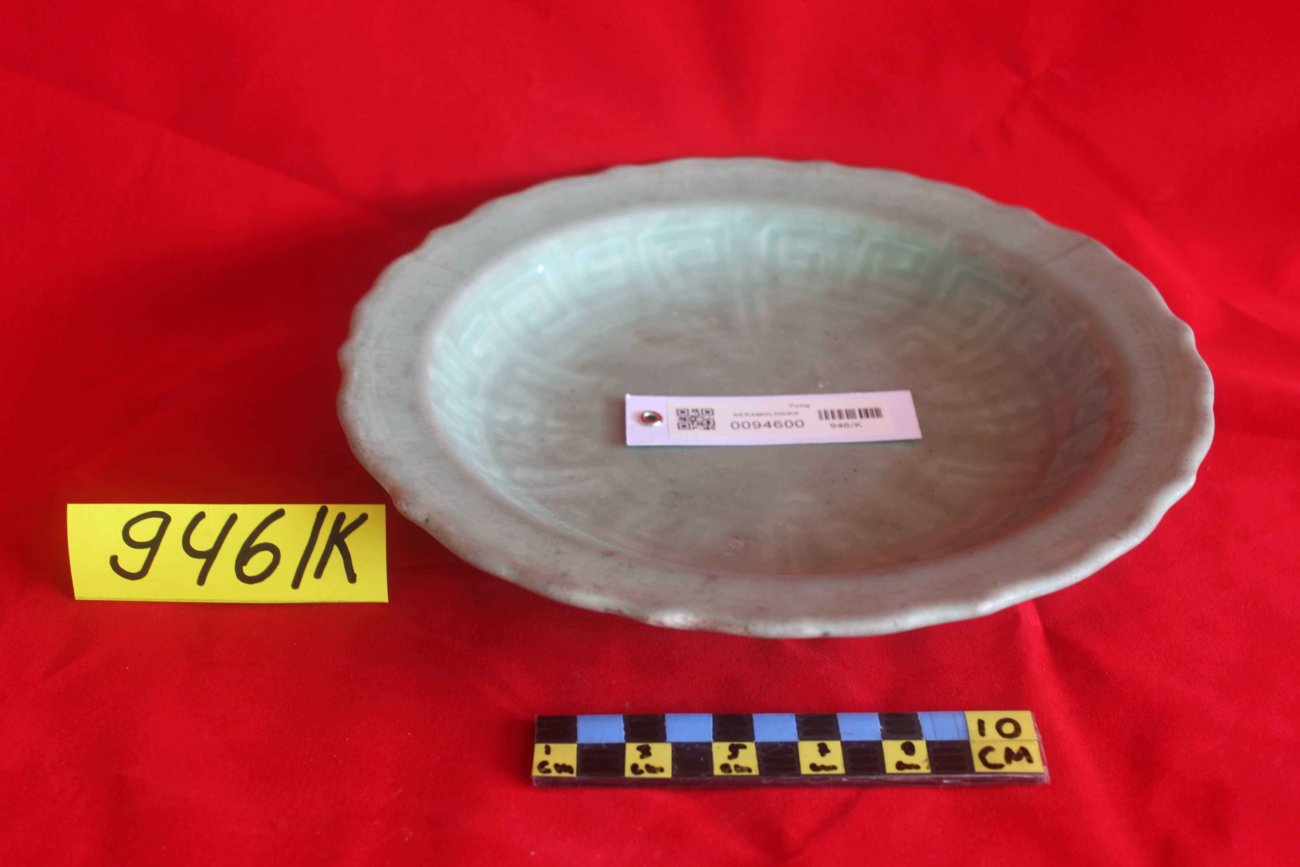 Terbuat dari tanah liat, bentuk bulat cekung dengan glasir warna hijau seladon. Pada permukaan dipenuhi motif bunga teratai, bagian pinggir bergelombang. Cina, Dinasti Sung abad 10-12 M.