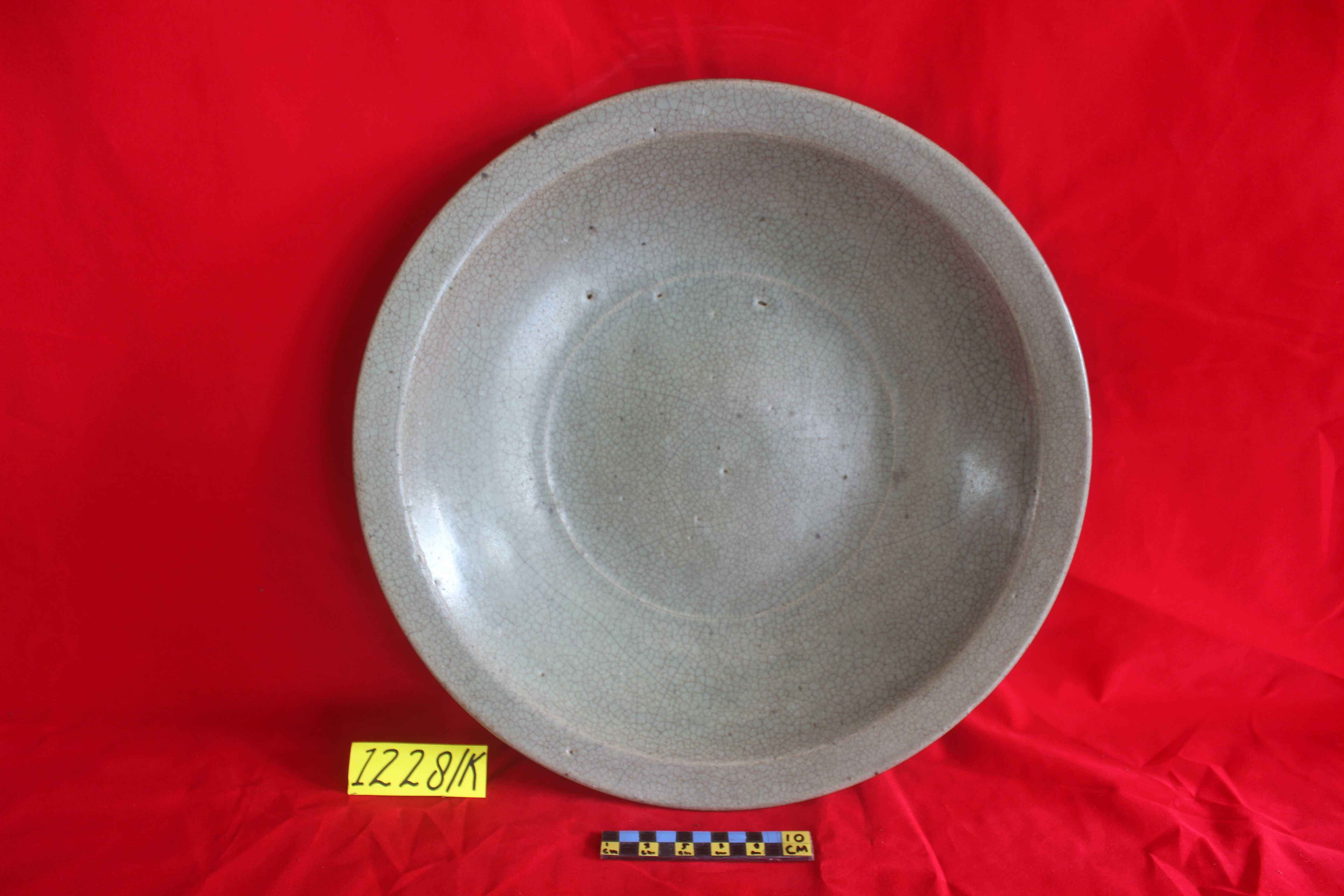 Terbuat dari tanah liat, bentuk bulat cekung, kaki rendah, bibir lebar membalik keluar. Glair warna hijau kecoklatan, retak seribu, po;os, dasar tidak diglasir.