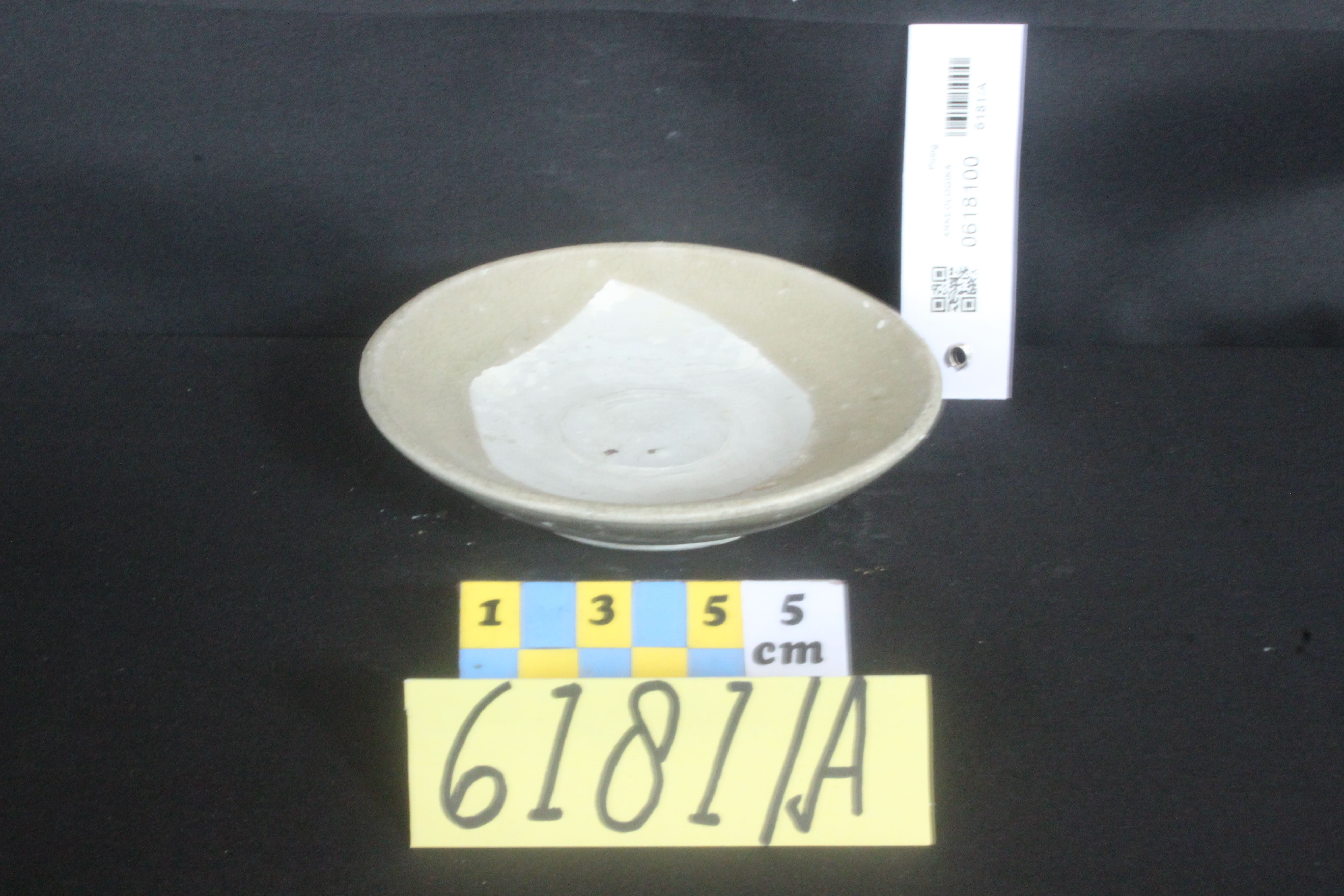Terbuat dari tanah liat yang mengandung unsur batuan halus, bentuk bulat cekung berglasir warna abu-abu, retak seribu. Pada bagian tengah/pusat terdapat motif bunga timbul, pada bagian ini tidak ada glasir atau glasirnya terkelupas akibat terendam air laut. Berkaki tinggi dan dasar rata tanpa glasir. Kondisi benda utuh/baik tetapi masih ada sisa-sisa karang laut yang menempel. Cina, Dinasti Sung abad 10-13 M.