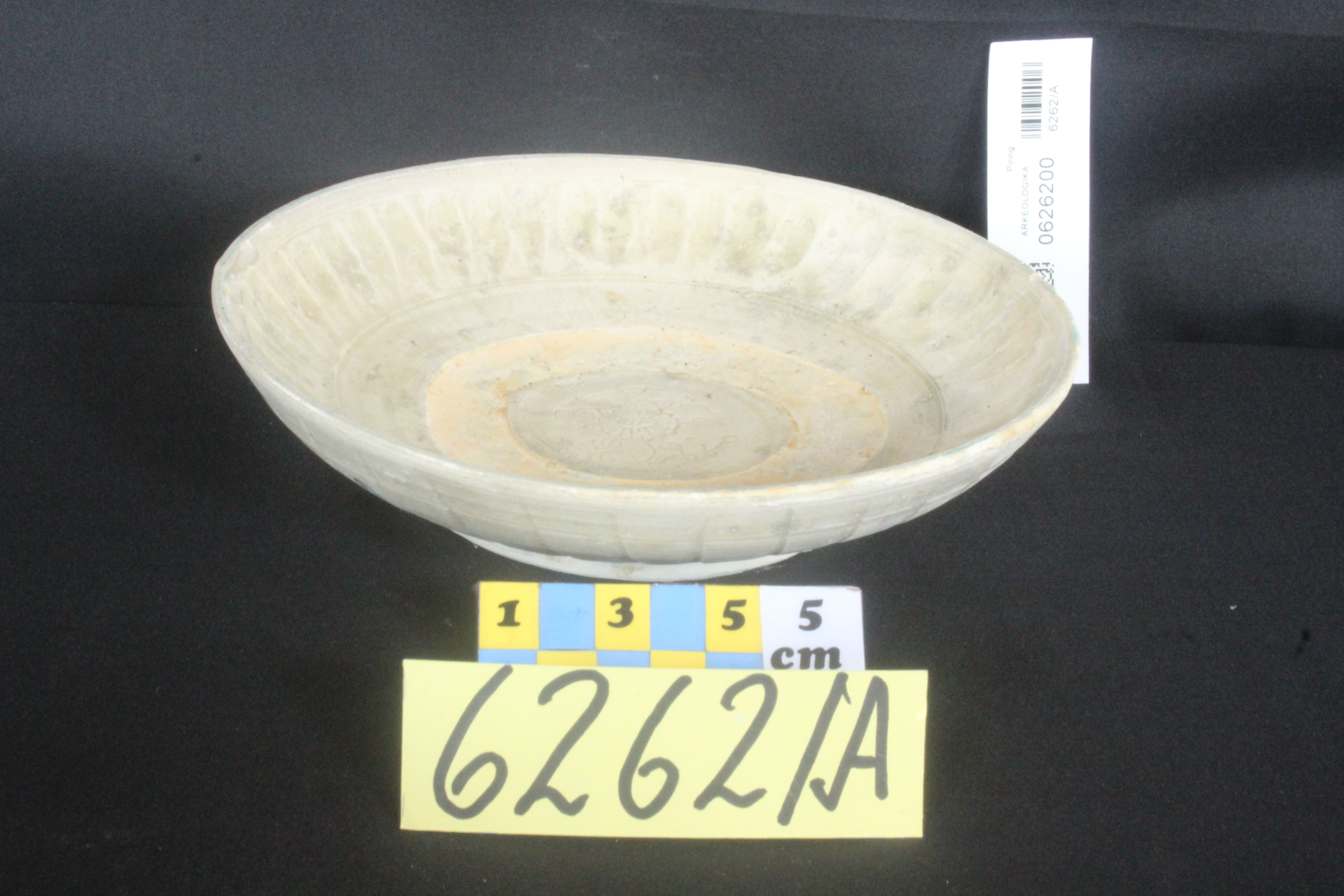 Terbuat dari tanah liat, bentuk bulat cekung dan berkaki, bibir rata, berglasir warna krem dan keabu-abuan. Dinding bagian dalam dan luar bergaris-garis vertikal, dasar dalam bercap flora dalam lingkaran biskwit. Pada saat ditemukan sebgaian permukaan tertutup karang laut. Cina, Dinasti Sung abad 10-13 M.