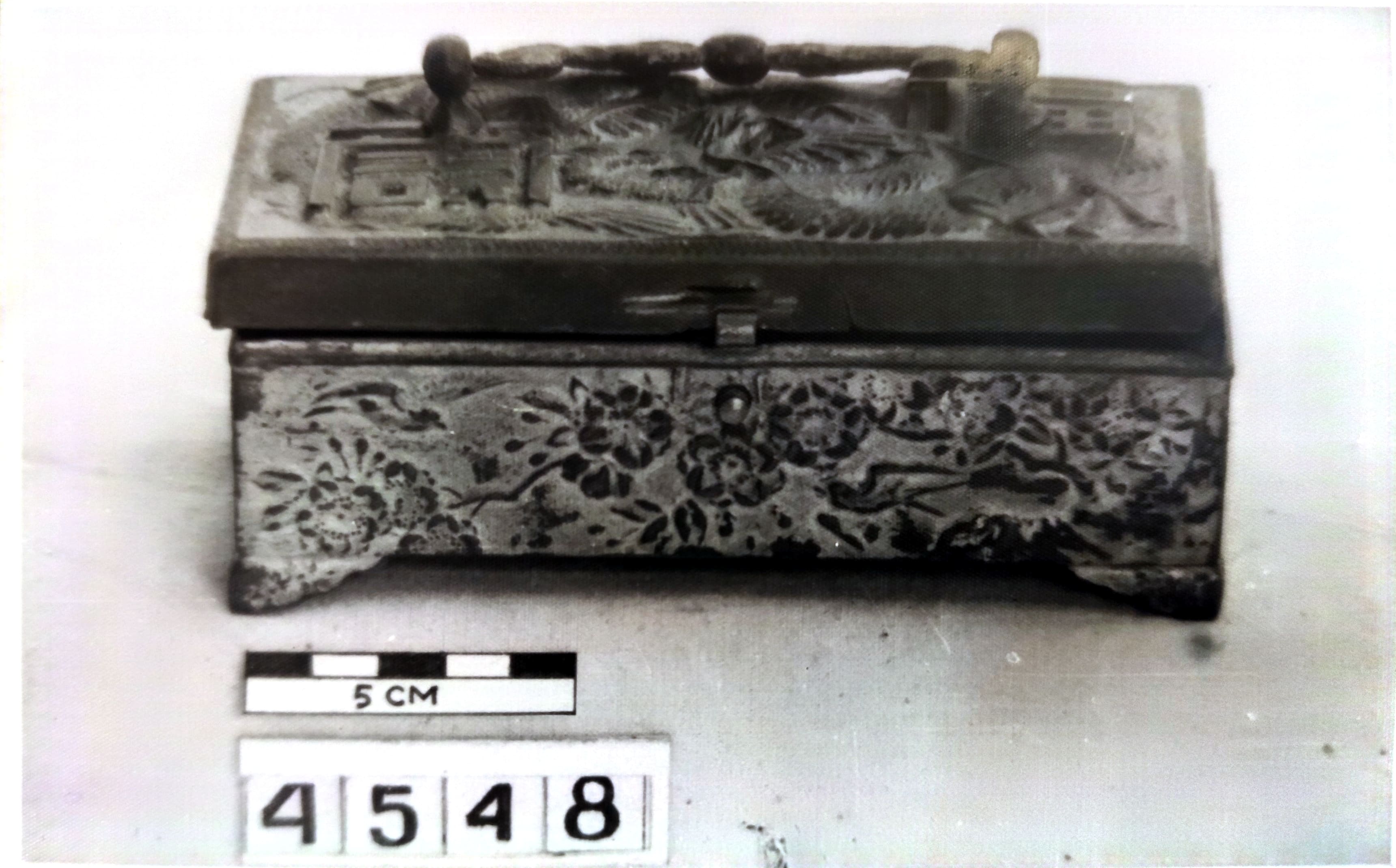 Benda ini terbuat dari bahan porselin dan berwarna putih. Bentuknya bundar dengan lingkaran kaki kecil dan bagian bibir mencuat keluar. Memiliki ornamen berupa kembang dan tulisan berwarna biru. Berglasir retak-retak dengan warna dasar hijau telur itik. Pada dasar atas terdapat lingkaran biscuit warna coklat. Keadaan baik. Koleksi ini merupakan peninggalan dari Kesultanan Kutai.