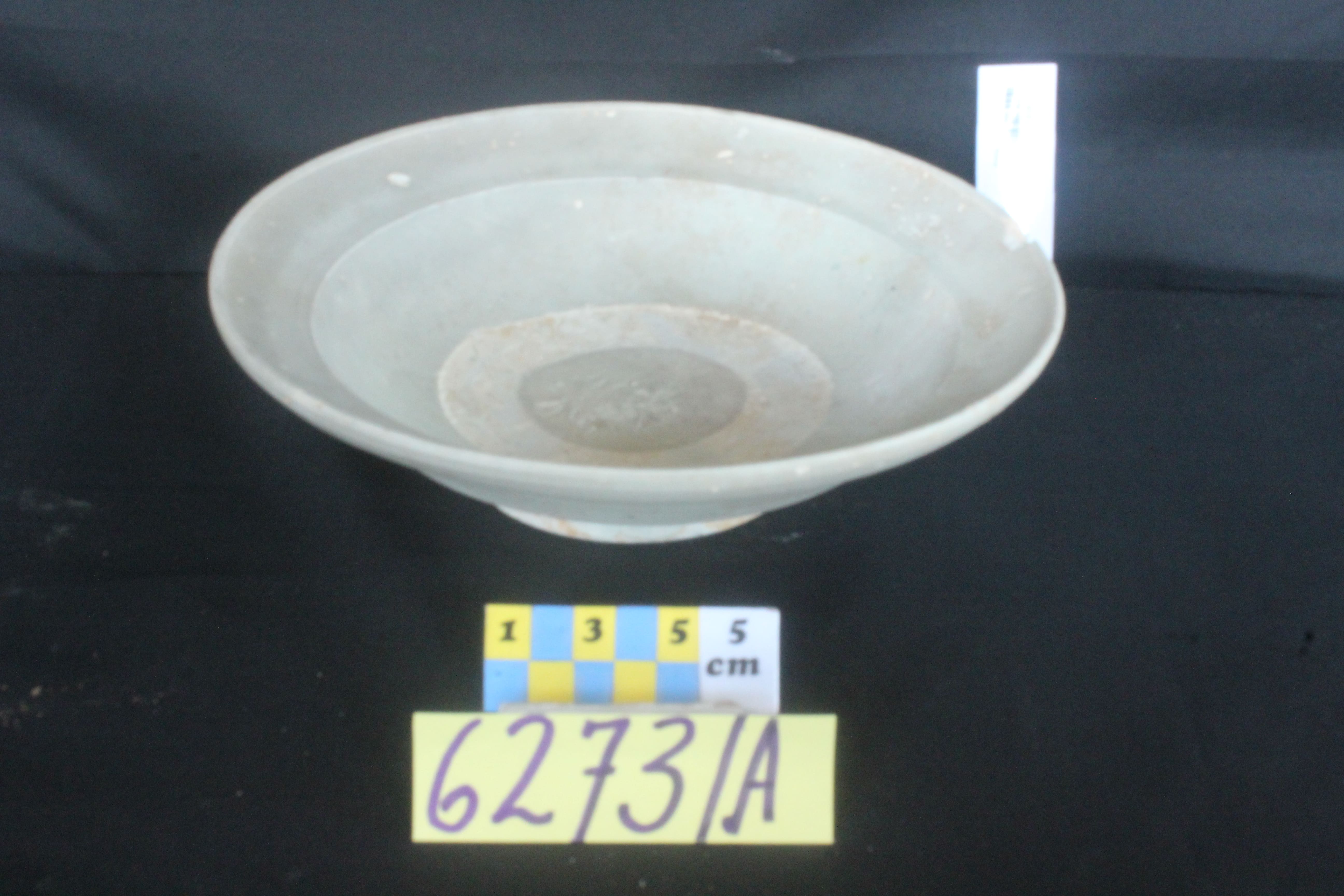 Terbuat dari tanah liat, bentuk bulat cekung dan berkaki, bibir rata membalik ke dalam dan somple satu bagian, berglasir warna abu-abu. Pada bagian tengah atas terdapat cap motif bunga di dalam lingkaran biskwit, sedangkan dinding bagian atas dan bawah polos. Ketika ditemukan sebagian permukaan tertutup karang laut. Cina, Dinasti Sung abad 10-13 M.