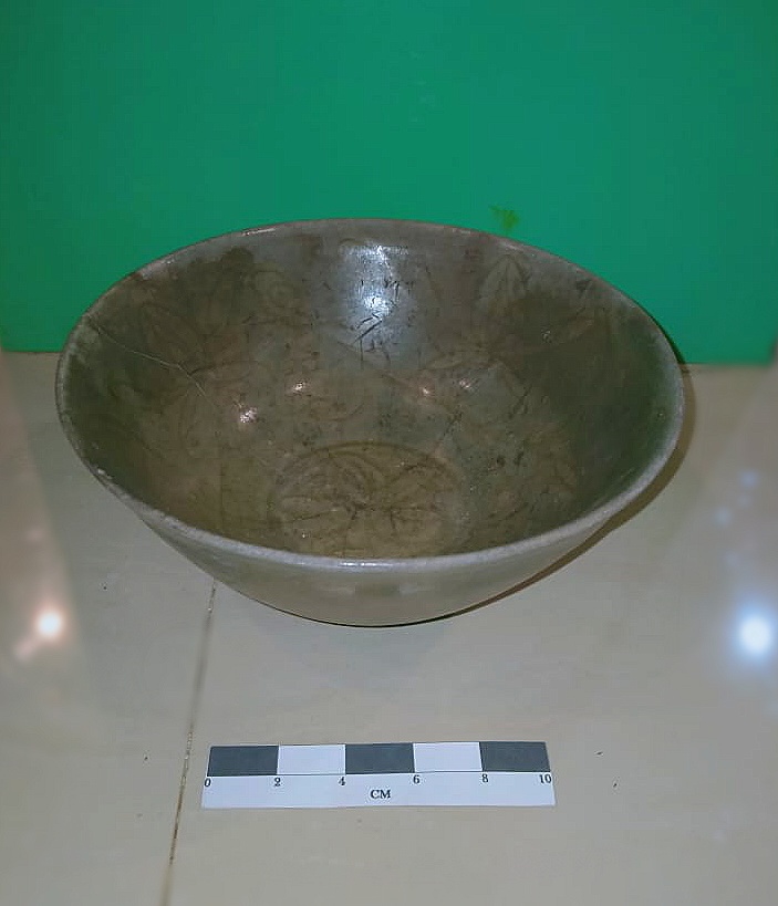 Terbuat dari tanah liat, bentuk bulat cekung, berkaki rendah dengan glasir warna abu-abu, dasar bawah tanpa glasir warna coklat. Pada permukaan atas dan bawah terdapat sisa-sisa karang laut yang menempel. CIna. DInasti Sung abad 10-13 M.