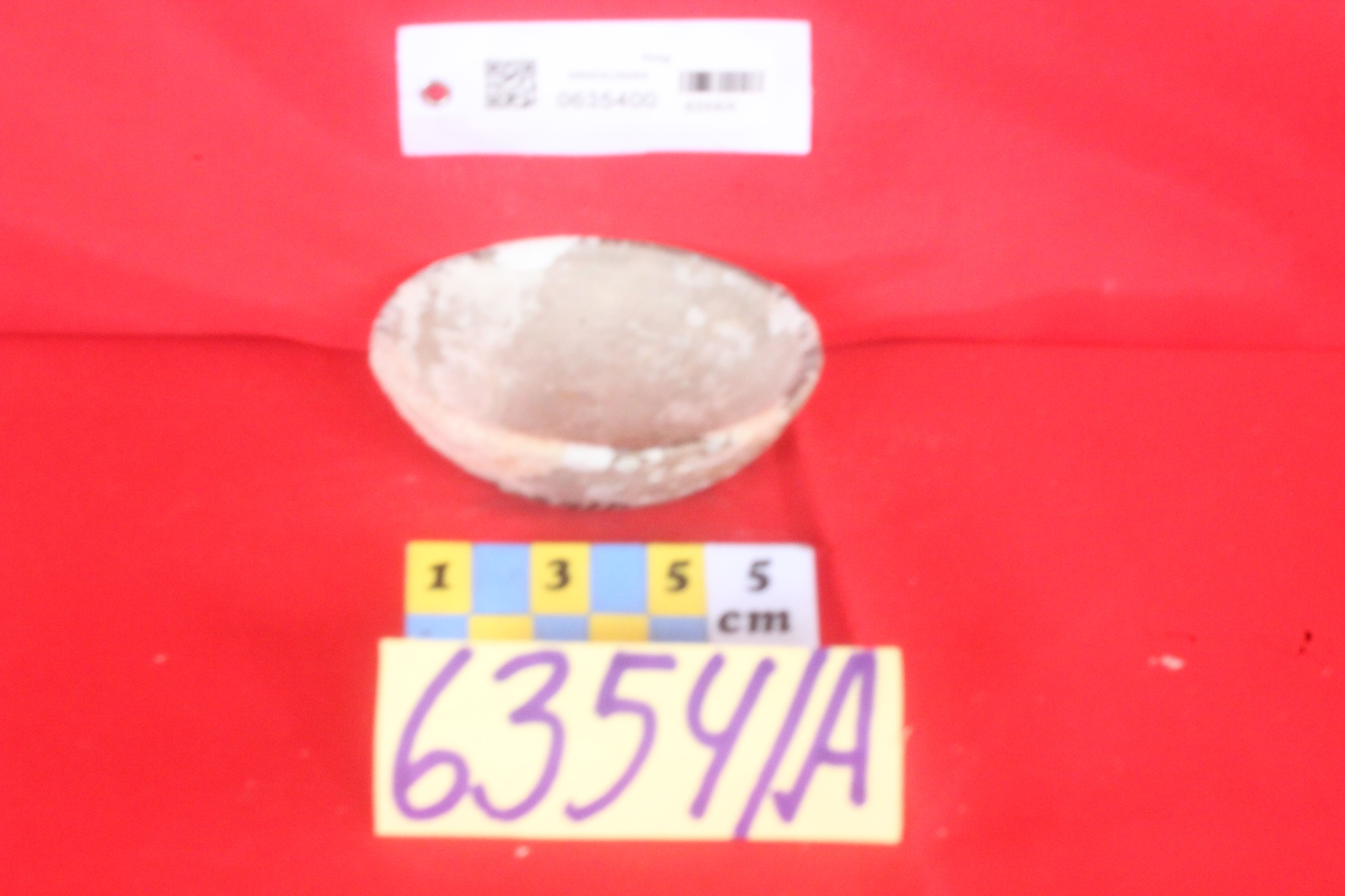 Terbuat dari tanah liat, bentuk bulat cekung, berglasir warna abu-abu, retak seribu. Bibir rata tanpa glasir , dindingnya polos, dan dasar bawah rata tanpa glasir. Pada peremukaan atas dan bawah terdapat sisa-sisa karang laut yang menempel. Cina, Dinasti Sung abad 10-13 M.
