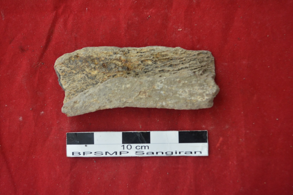 Terbuat dari tanah liat, bentuk bulat cekung dan berkaki, berglasir warna abu-abu dan krem. Bibir tipis membalik ke luar, dinding atas dan bawah polos, dasar bawah rata tanpa glasir. Permukaan atas dan bawah tertutup karang laut pada saat ditemukan. Cina, Dinasti Sung abad 10-13 M.