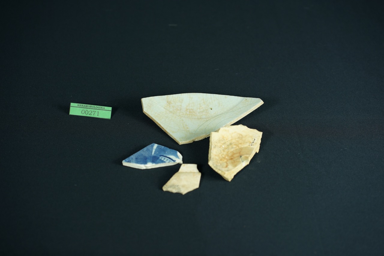 Bentuk bulat cekung, terbuat dari tanah liat, berglasir warna abu-abu. Bibir rata tipis membalik ke luar tanpa glasir, dinding atas dan bawah polos, glasirnya terkelupas sehingga nampak warna asalnya tanah warna merah bata, dasar bawah rata tanpa glasir. Pada permukaan atas dan bawah terdapat sisa-sisa karang laut yang menempel. Cina, Dinasti Sung abad 10 - 13 M.