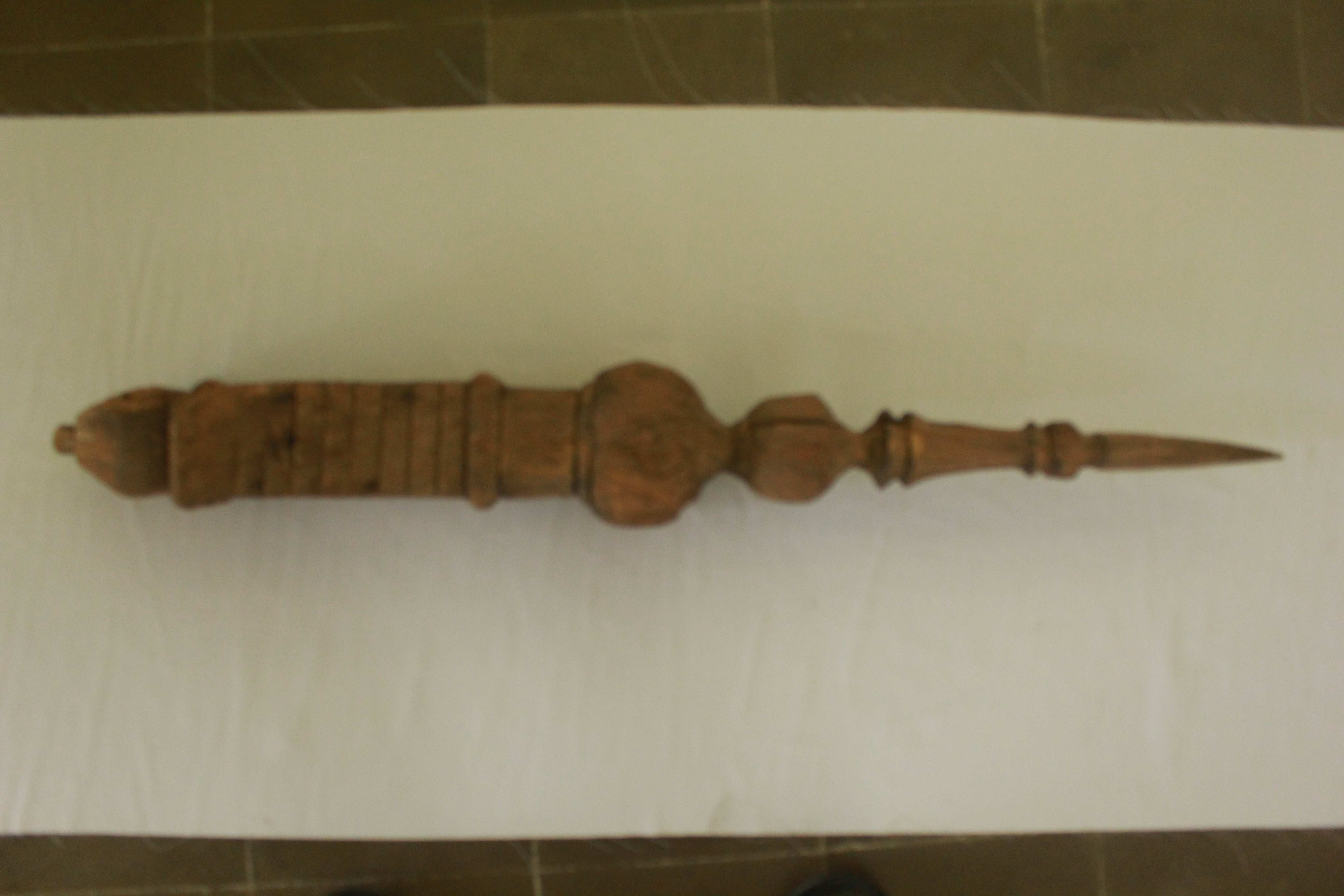 Bentuk bulat cekung, terbuat dari tanah liat dengan glasir warna abu-abu. Bibir rata tipis membalik ke luar tanpa glasir, dinding atas dan bawah polos, glasirnya terkelupas sehingga nampak tanah aslinya warna merah bata/krem, dasar bawah rata tanpa glasir. Pada permukaan atas dan bawah terdapat sisa-sisa karang laut yang menempel. Cina, Dinasti Sung abad 10-13 M.