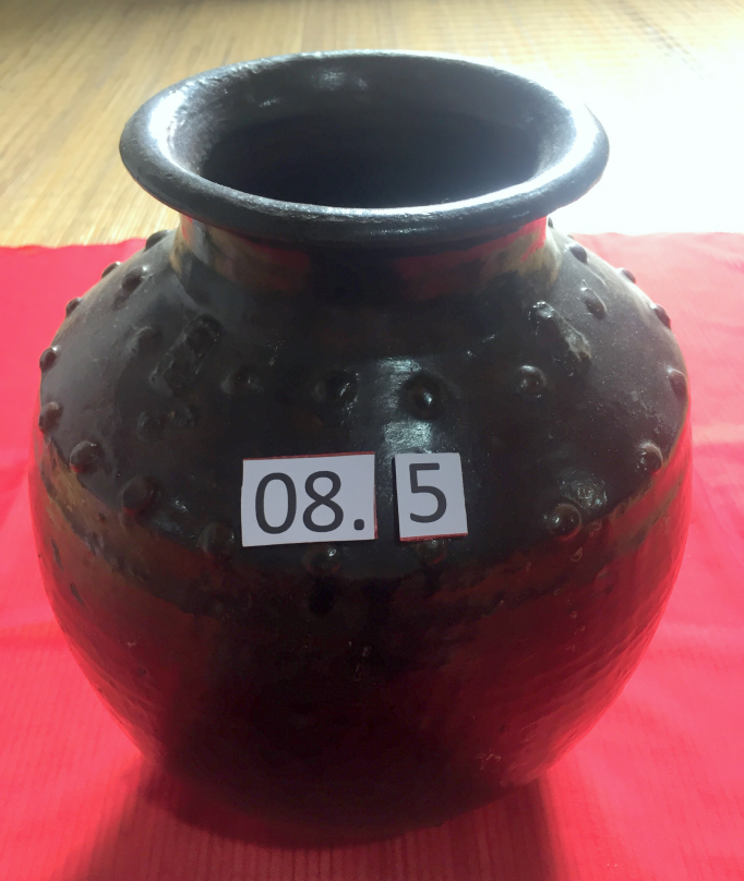 Bentuk bulat cekung, berkaki dan berdinding lebar ke atas, berglasir warna abu-abu. Bibir rata tanpa glasir dan sompel/pecah satu bagian, pada bagian tengah atas terdapat cap bermotif flora di dalam lingkaran biskwit, dinding atas dan bawah polos dengan glasir tidak rata karena terkelupas, dasar bawah tanpa glasir. Pada saat ditemukan seluruh permukaan atas dan bawah tertutup karang laut . Cina, Dinasti Sung abad 10-13 M.