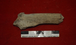 Terbuat dari tanah liat, bentuk bulat cekung dan berkaki, berglasir warna abu-abu. Bibir bergelombang, pada bagian tengah atas terdapat cap motif flora di dalam lingkaran biskwit, sedangkan pada dindingnya bermotif garis-garis vertikal dan gelombang, dasar bawah rata tanpa glasir. Pada saat ditemukan permukaan atas dan bawah tertutup karang laut. Cina, Dinasti Sung, abad 10-13 M.