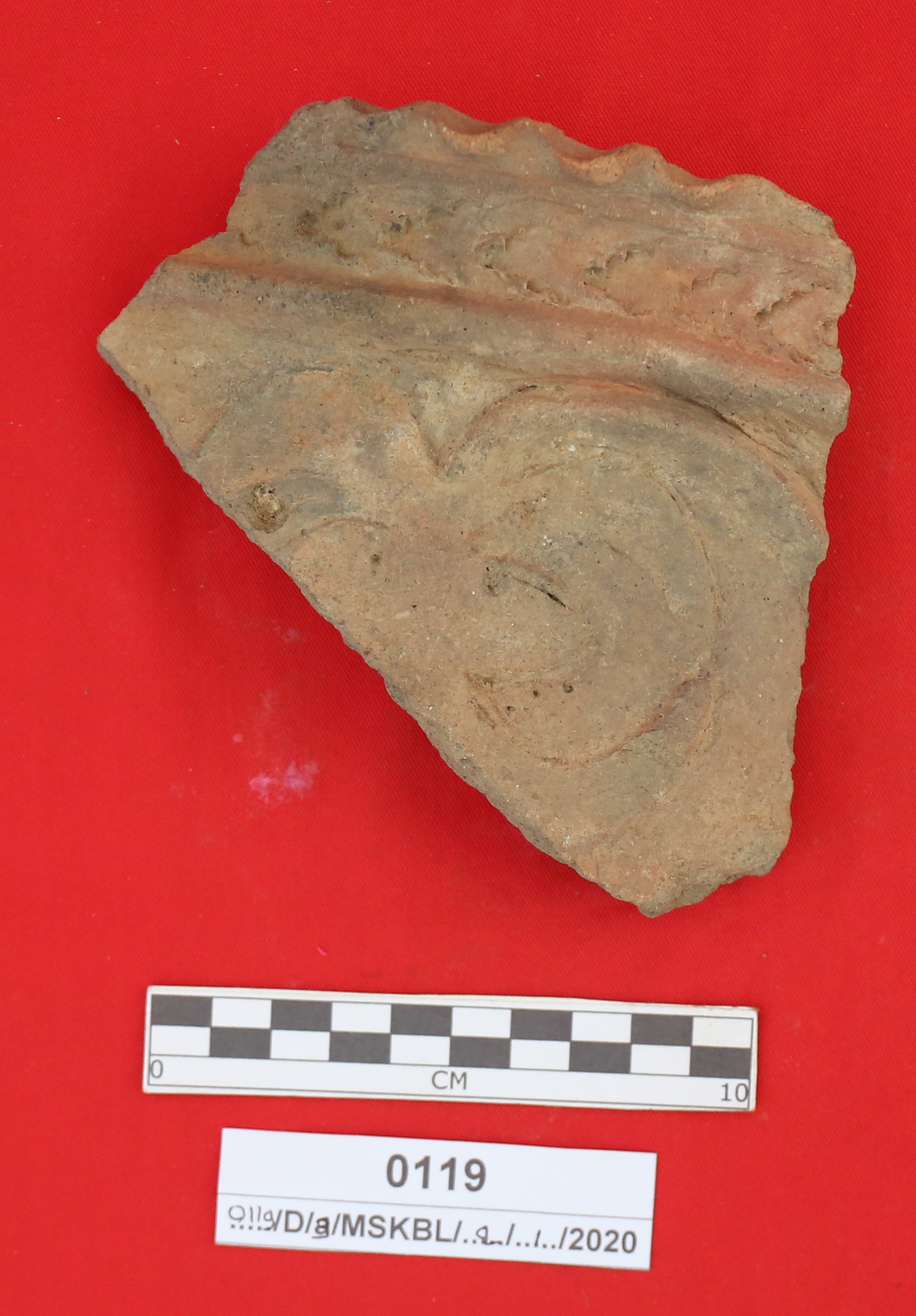 Terbuat dari tanah liat, bentuk bulat cekung berdinding lebar, kaki rendah, berglasir warna abu-abu. Bibir rata tanpa glasir, pada bagian tengah / dasar atas terdapat cap motif flora di dalam lingkaran biskwit, dinding beralur-alur tekan vertikal, dasar bawah rata tanpa glasir. Pada permukaan atas dasn bawah terdapat sisa-sisa karang laut yang yang menempel. Cina, Dinasti Sung abad 10-13 M.
