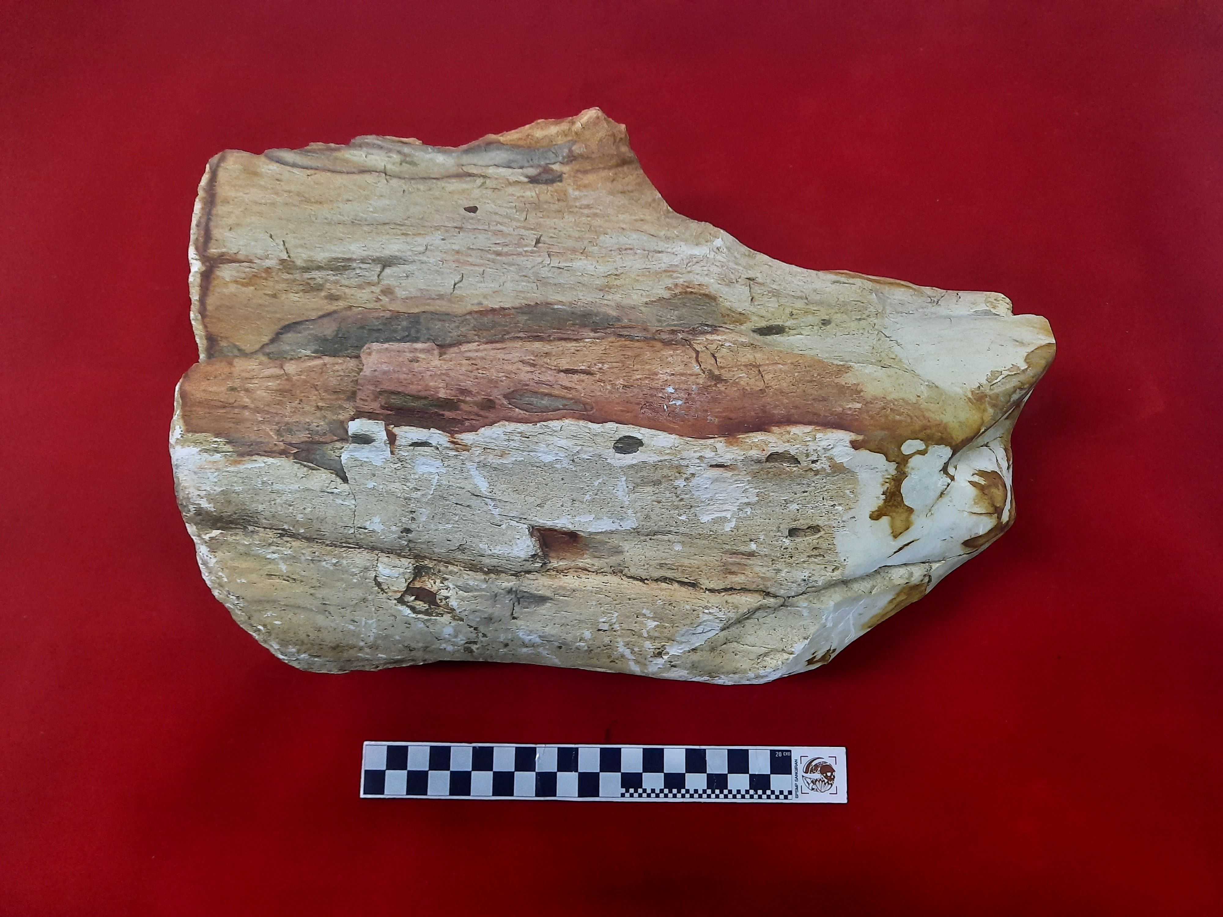 Terbuat dari tanah liat, bentuk bulat cekung dan berkaki rendah, berglasir warna abu-abu, retak seribu. Bibir rata sompel/pecah satu bagian, pada bagian tengah/dasar atas terdapat cap motif flora di dalam lingkaran biskwit, dinding beralur-alur tekan vertikal, dasar bawah rata tanpa glasir. Pada permukaan atas dan bawah pada saat ditemukan tertutup karang laut. Cina, Dinasti Sung abad 10-13 M.