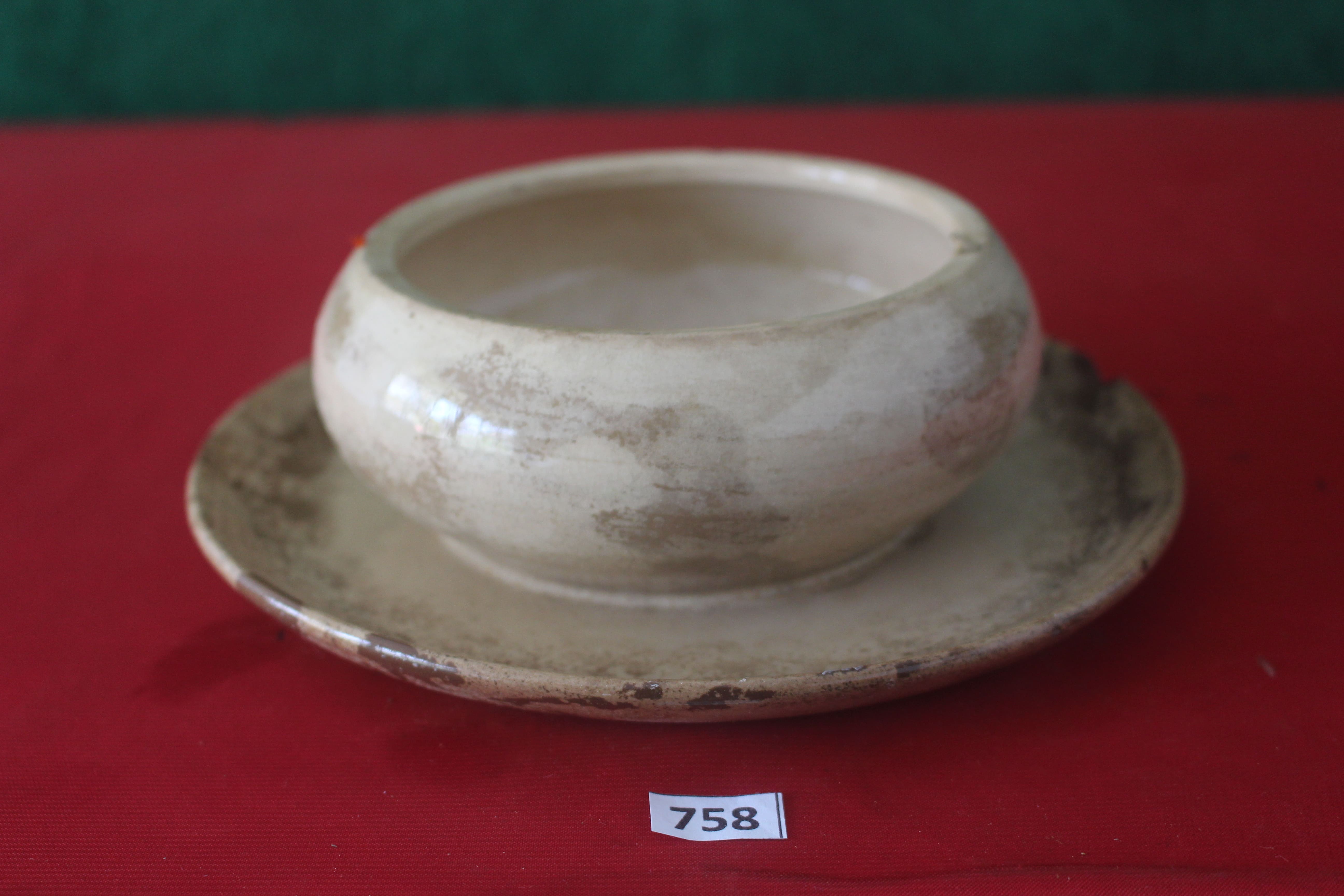 Terbuat dari tanah liat putih (white clay). Teknik roda putar, dengan pembakaran suhu ± 1200 ?c. Bandar bundar dengan dinding berlekuk seperti huruf S. bibir lekuk daun, lebar pinggiran membulat, penopang kaki sedang, piinggiran menyudut dasar datar. glasir putih suram, teknik dasar datar, glasir putih suram, teknik celup. hiasan dengan kuas, motif tulisan arab pada bibir dan badan dalam bunga botan warna biru sesudah diglasir. digunakan sebagai wadah makanan dalam upacara adat/hiasan.
