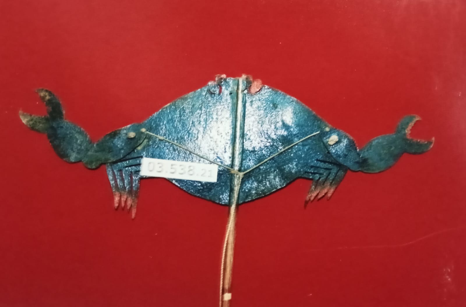 Terbuat dari tanah liat, bentuk bulat cekung, berglasir warna putih. Bibir rata membalik ke luar dan sedikit sompel, pada bagian tengah atas dihiasi dengan seekor ikan warna putih biru, diatasnya terdapat motif corak awan 3 buah warna biru, bagian bawah polos. Cina, Dinasti Ming abad 16 M.