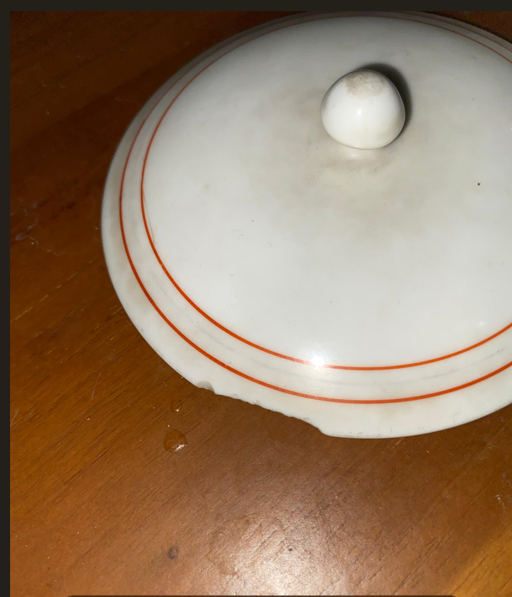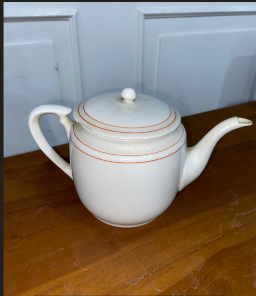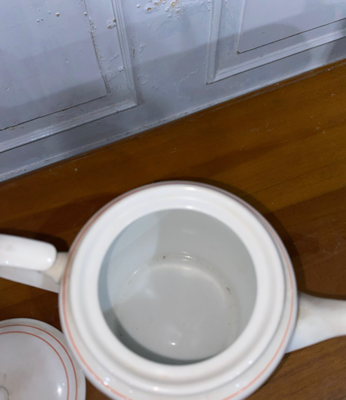 Koleksi ini merupakan teko berwarna putih dengan motif sederhana, 2 garis merah yang melingkari koleksi. Koleksi ini terbagi ke dalam 2 bagian, teko dan penutupnya. Teko sendiri memiliki pegangan tangan dan mulut teko. Untuk tutup teko, terdapat bagian yang menonjol untuk memudahkan kita membukanya. Kondisi Koleksi Koleksi dalam kondisi yang cukup baik dengan kerusakan di bagian tutup teko. Kerusakan tersebut berupa bagian yang pecah. Detail ukuran: Diameter Tutup Teko 9, 4 cm Diameter Lubang Teko 6, 8 cm