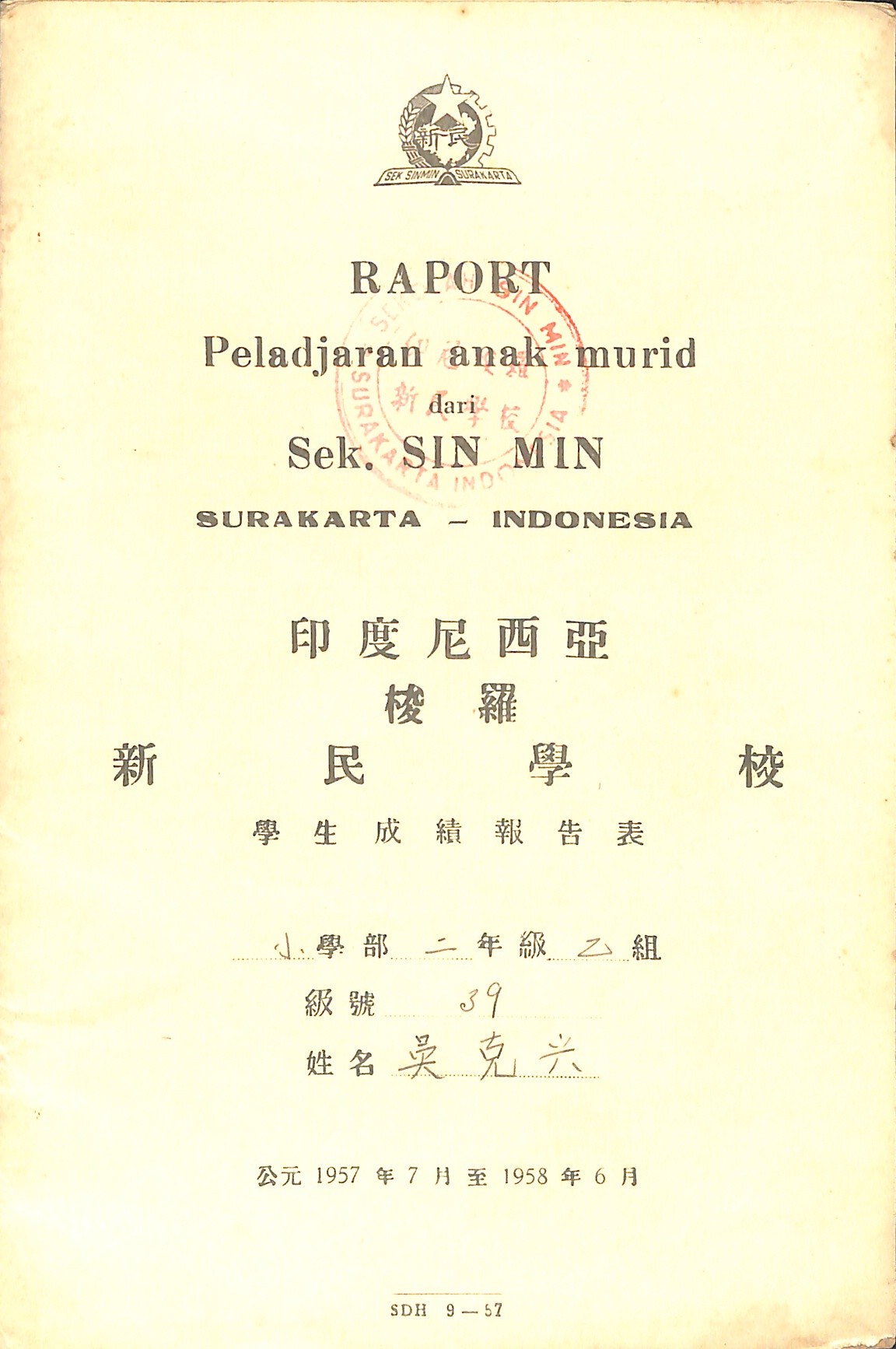 Judul Buku Raport Pelajaran Anak Murid dari Sek. Sin Min Surakarta - Indonesia No. 39. Tahun pelajaran 1957 - 1958
