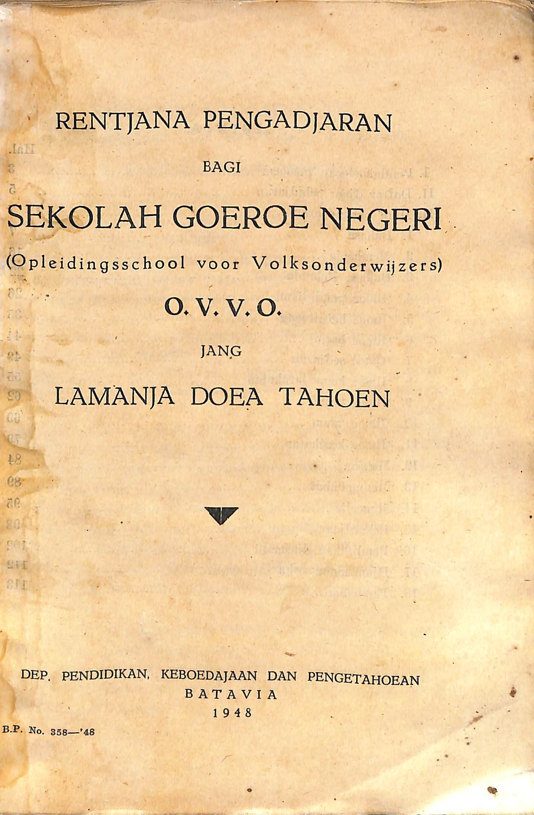 Judul buku Rentjana Pengadjaran Bagi Sekolah Goeroe Negeri (Opleidingsschool voor Volksonderwijzers) O.V.V.O Jang Lamanja Doea Tahoen. Tahun terbit 1948. Diterbitkan oleh Departemen Pendidikan Kebudajaan dan pengetahoean, Batavia, 1948.