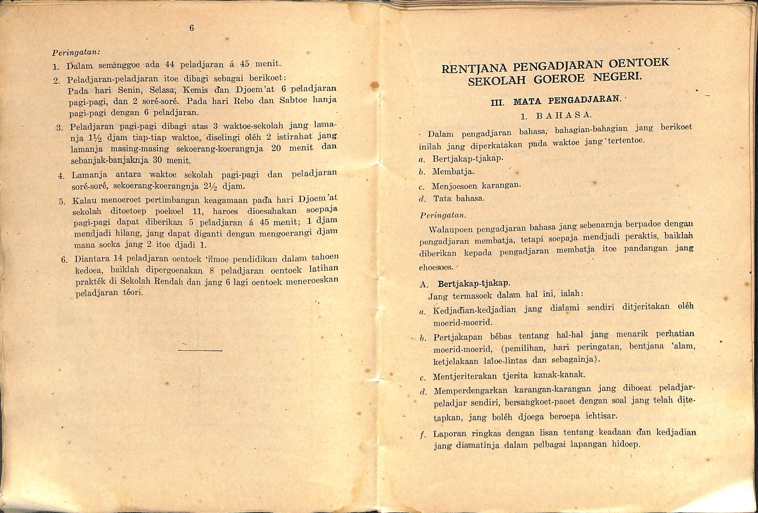 Buk ini bersisi pendahuluan umu, daftar jam pelajaran dan mata pelajaran : seperti Bahasa, Ilmu Pendidikan, Menulis, Menggambar, Berhitung, Sejarah, Kesehatan, Pendidikan Jasmani, Ilmu Bumi, dan Kemasyarakatan. Buku ini menggunakan kurikulum tahun 1947 - 1951 yaitu kurikulum pertama yang lahir pada masa kemerdekaan, memakai istilah Leer Plan (Bahasa Belanda) yang artinya Rencana Pembelajaran. Buku ini juga menggunakan ejaan Soewandi 1947, yaitu ejaan Republik yang menggunakan ketentuan ejaan dalam Bahasa Indonesia yang berlaku sejak 19 Maret 1947. Ejaaan ini dikenal sebagai ejaan Soewandi, beliau menjadi Menteri Pendidikan dan Kebudayaan pada waktu itu.