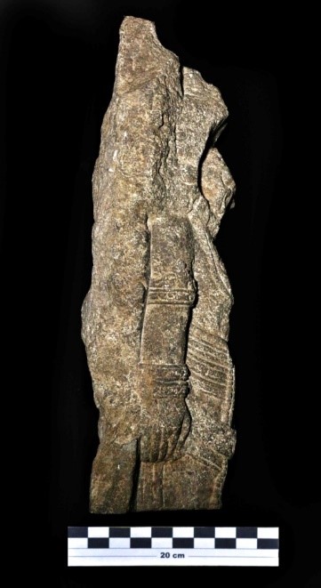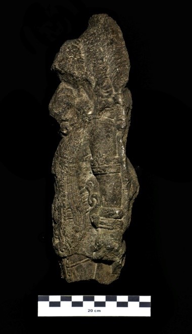 Replika arca hanya tinggal bagian lutut hingga bagian atas, sedangkan lutut ke bawah hilang. Bagian sandaran arca (stela) berbentuk persegi cenderung oval. Posisi arca berdiri (samabhangga). Kepala memakai amahkota yang sudah aus, bagian wajah rusak yang diisi dengan motif sulur-suluran. Rambut ikal terurai ke belakang. Kedua tangan lurus di samping tubuh. Hiasan yang dipakai yaitu kelat bahu berhias stiliran simbar, gelang tangan rangkap dua. Menggunakan hiasan dada bermotif suluran. Kain panjang (wastra) dengan hiasan pinggang depan berbentuk tumpal. Selendang melintang di bagian paha, kain sampur berbentuk ikal.