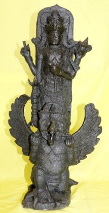Wisnu termasuk kedalam Trimurti (tiga dewa utama dalam agama Hindu) yang berperan sebagai dewa pemelihara. Dalam usahanya untuk menolong manusia dalam kesukaran, ia sering menjelma turun kedunia manusia, antara lain sebagai Krisna dan Rama. Wisnu berkendaraan (Wahana) Burung garuda. Aliran Waishawa adalah sebutan untuk aliran yang secara khusus memuja Wisnu. Wisu digambarkan diatas pundak Garuda. Wisnu ini bertanganemapat; tanagn kiri depan memegang sesuatu yang tidak jelas, tangan kanan depan memegang Wajra, tangan kiri belakangmemegang sangkha bersayap, tangan kanan belakang memegang cakra yang sudah hilang.
