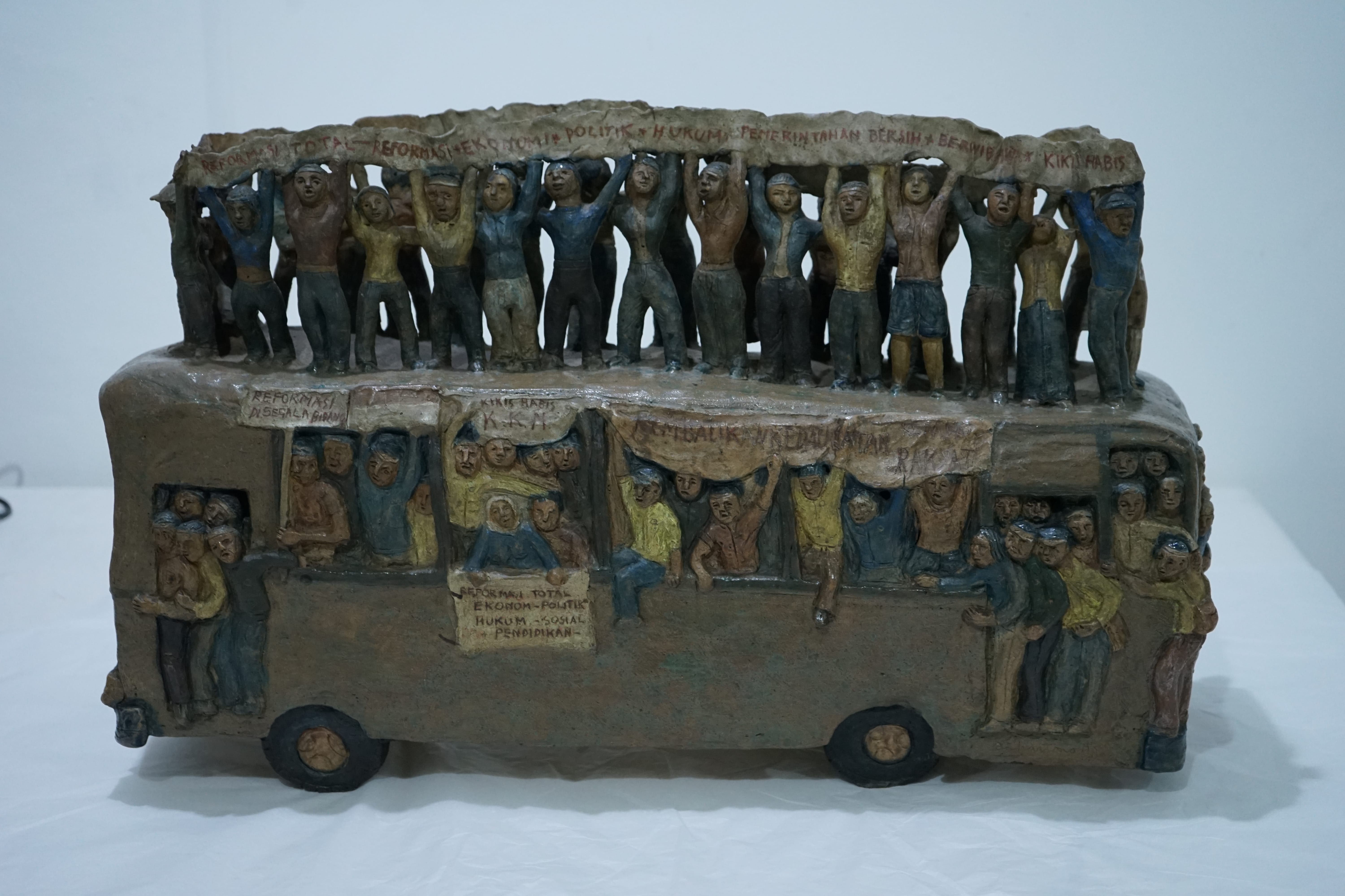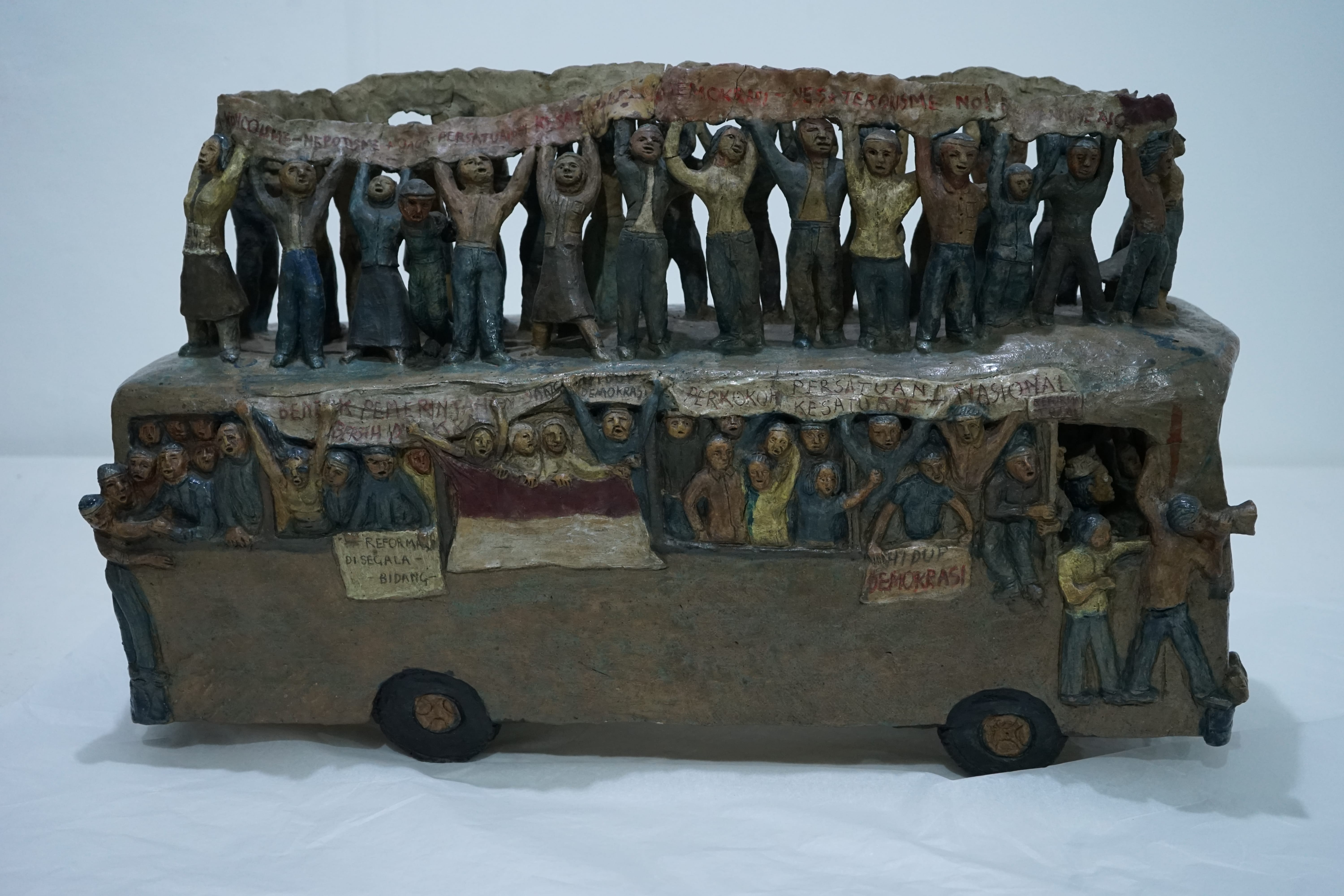 Sri Hartono Repormasi Tanah liat dengan teknik pijat tekan 64,9x23x39,9 cm 1998 Deskripsi: Karya keramik ini berbentuk bus yang berisikan banyak penumpang sehingga penumpang berdiri di atas bus. Pada bagian atas bus terdapat 31 orang penumpang yang memegang bendera merah putih dan spanduk yang bertuliskan "REFORMASI TOTAL-REFORMASI*EKONOMI*POLITIK*HUKUM X PEMERINTAHAN BERSIH + BERWIBAWA * KIKIS HABIS KORUPSI - KOLUSI-KONCOISME - NEPOTISME + JAGA PERSATUAN DAN KESATUAN NANO DEMOKRASI - YES* TERORISME NO! PREMANISME NO!". Pada bagian belakang bus terdapat dua orang bersebelahan. Di bagian baju orang pertama terdapat tulisan "NENEK PEDULI" dan pada baju orang kedua bertuliskan "IBU PEDULI". Selain itu, orang yang berada di dalam bus juga membawa spanduk. Pada sisi kanan bus, spanduk pertama bertuliskan "BENTUK PEMERINTAHAN YANG BERSIH DARI KKN". Spanduk kedua bertuliskan "REFORMASI DI SEGALA BIDANG". Spanduk yang ketiga bertuliskan "HIDUP DEMOKRASI". Spanduk keempat bertuliskan "PERKOKOH PERSATUAN KESATUAN NASIONAL". Pada spanduk kelima bertuliskan "REFORMASIS TOTAL". Sedangkan pada spanduk keenam bertuliskan "HIDUP DEMOKRASI" dan terdapat satu bendera merah putih. Pada bagian kiri bus, terdapat satu bendera merah putih dan empat spanduk. Spanduk pertama bertuliskan "REFORMASI DI SEGALA BIDANG". Kemudian spanduk kedua bertuliskan "KIKIS HABIS KKN". Ketiga,"KEMBALIKAN KEDAULATAN KEPADA RAKYAT". Spanduk keempat bertuliskan "REFORMASI TOTAL EKONOM-POLITIK HUKUM-SOSIAL-PENDIDIKAN-". Pada bagian dalam bus terdapat orang yang memegang spanduk. Terdapat tiga spanduk. Spanduk pertama bertuliskan "TURUNKAN HARGA SEMBAKO". Spanduk kedua bertuliskan "REFORMASI EKONOMI POLITIK-HUKUM". Spanduk ketiga bertuliskan "REFORMASI TOTAL TAL TAL TAL". Kemudian pada bagian atas bus terdapat tulisan "GERAKAN MORAL MAHASISWA 98". Pada bagian depan bus terdapat plat dengan nomor "B 25798" dan di bawahnya terdapat tanda tangan dan nama "Hartono". Pada bagian belakang bus terdapat plat dengan tulisan "Juli 1998". Keramik ini dibuat dengan teknik pijat tekan. Pada tahun 1998 di Indonesia terjadi peristiwa reformasi. Reformasi merupakan peristiwa gerakan yang menghendaki sebuah adanya perubahan yang lebih baik dari segala bidang, baik dari bidang politik, sosial, ekonomi, hukum, dan budaya. Krisis yang melanda kehidupan masyarakat Indonesia dan jatuhnya Soeharto menjadi cikal bakal lahirnya Reformasi. Biografi: Sri Hartono merupakan pematung terracotta yang berasal dari Pasar Seni Jaya Ancol. Ia lahir di Solo pada tahun 1935. Ia bergabung dengan Himpunan Budaya Surakarta (HBS) pada tahun 1954. Ia menjalani pendidikan di Sekolah Tinggi Seni Rupa Indonesia (ASRI) gaya lama di Yogyakarta. Sri Hartono mengambil inspirasi dari permasalahan kehidupan. Dengan begitu, karya-karyanya turut menyumbang pada kemanusiaan. Ia memiliki falsafah bahwa dalam hidup ini kita tidak dapat sekadar mengisi perut atau berpakaian mewah, tetapi harus diisi dengan sesuatu yang indah dan berarti. Arti tersebut memiliki banyak tafsiran, seperti segala sesuatu yang dapat dilihat atau didengar dari lingkungan sekitar. Ia pernah mengikuti pameran “Save Our Ocean” (Jakarta, 2001), “Keramik Kreatif” (Jakarta, 2003), “Keramik Kreatif dari 4 Kota” (Jakarta, 2005), CP Biennale “Urban/Culture” (Jakarta, 2005), dan “Manifesto” (Jakarta, 2008).