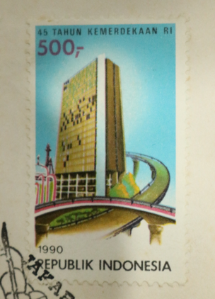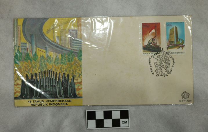 "Amplop berbahan kertas dan dibungkus plastik OPP. Bagian kiri amplop bergambar tugu proklamasi, tanaman, infrastruktur jalan layang, dan gedung. Bagian kanan atas amplop tertempel 2 perangko dan bagian bawahnya terstempel ""Hari Terbit Pertama Jakarta - 17 - 8 - 1990"". Kedua prangko memiliki ukuran yang sama, yaitu panjang 2,5 cm dan lebar 4,1 cm. Selain itu, kedua prangko juga bertuliskan ""45 Tahun Kemerdekaan RI"" dan tahun 1990. Pinggiran prangko berbentuk gerigi. Prangko memiliki gambar dan nominal berbeda. 1. Prangko bernominal 200 rupiah. Prangko berwarna dominan merah dengan gambar seorang pemuda sedang menancapkan bambu runcing dengan bendera merah putih di atasnya. 2. Prangko bernominal 500 rupiah. Prangko berwarna dominan biru dengan gambar gedung tinggi dan infrastruktur jalan layang. "