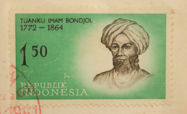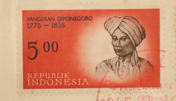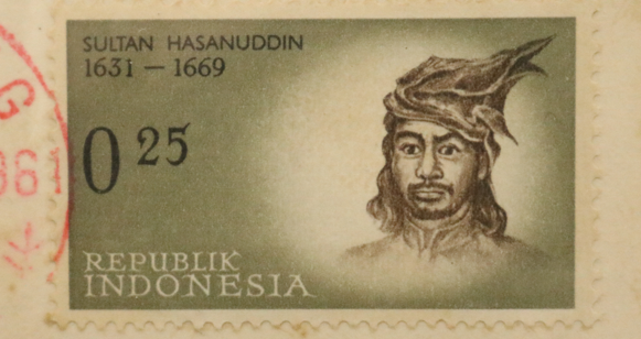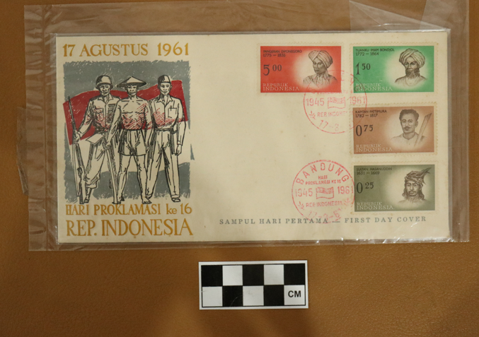 "Amplop berwarna putih dan telah menguning. Tampak depan amplop tertempel 4 prangko. Amplop di bagian kiri bergambarkan 3 laki-laki dengan latar belakang berwarna abu-abu dan bendera merah putih, serta tertulis ""17 AGUSTUS 1961"", ""HARI PROKLAMASI ke 16, REP. INDONESIA"". Bagian bawah kiri amplop tertulis ""SAMPUL HARI PERTAMA _ FIRST DAY COVER"". Prangko ditempel di bagian kiri dan dicap. Terdapat 2 cap, keduanya memiliki bentuk, warna dan tulisan yang sama. Cap berbentuk lingkaran dan berwarna merah. Cap bertuliskan ""BANDUNG"", ""HARI PROKLAMASI KE 16"" ""1945"", ""1961"", ""REP. INDONESIA"", ""17-8-61"" dan di bagian tengah cap terdapat bendera merah putih. Keempat prangko memiliki ukuran yang sama. Panjang: 4,2 cm dan lebar: 2,5 cm. Akan tetapi, keempat prangko tersebut memiliki gambar, warna dan nominal berbeda. 1. Prangko bernilai 5 rupiah memuat gambar Pangeran Diponegoro, berlatar warna merah dan bertuliskan ""PANGERAN DIPONEGORO"", ""1775 - 1835"", ""REPUBLIK INDONESIA"". 2. Prangko bernilai 1,5 Rupiah memuat gambar Tuanku Imam Bondjol, berlatar warna hijau dan bertuliskan ""TUANKU IMAM BONDJOL"", ""1772 - 1864"", ""REPUBLIK INDONESIA"". 3. Prangko bernilai 0,75 rupiah memuat gambar Kapitan Pattimura, berlatar warna cokelat dan bertuliskan ""KAPITAN PATTIMURA"", ""1782 - 1817"", ""REPUBLIK INDONESIA"". 4. Prangko bernilai 0,25 rupiah memuat gambar Sultan Hasanuddin, berlatar abu-abu dan bertuliskan ""SULTAN HASANUDDIN"", ""1631 - 1669"", ""REPUBLIK INDONESIA"". Kondisi prangko dan amplop memiliki noda di bagian pinggirannya dan permukaannya. "