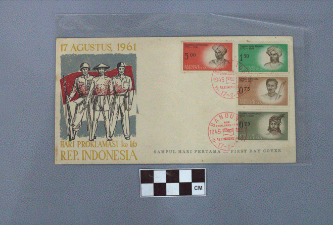 Sebuah amplop berbentuk persegi panjang dengan panjang 18,7 cm dan lebar 10 cm berwarna putih tulang. Pada bagian kiri depan amplop terdapat gambar berlatarbelakang abu-abu dengan gambar bendera merah putih dan tiga tokoh yang berdiri. Di atas gambar tersebut terdapat tulisan "17 AGUSTUS 1961" berwarna emas yang timbul. Di bagian bawah gambar, terdapat tulisan "HARI PROKLAMASI ke 16 REP. INDONESIA" berwarna emas yang timbul. Pada bagian kanan amplop terdapat empat prangko. Dengan posisi satu di sebelah kiri dan tiga di kanan. Prangko pertama di sebelah kiri berwarna merah dengan gambar Pangeran Diponegoro di sebelah kanan, tulisan "PANGERAN DIPONEGORO 1775 - 1835" berwarna hitam di sebelah kiri atas, lalu di bawahnya terdapat angka 5 0 0 berwarna hitam, dan di kiri bawah terdapat tulisan "REPUBLIK INDONESIA" berwarna putih. Prangko kedua di sebelah kanan baris pertama berwarna hijau muda dengan gambar Tuanku Imam Bonjol di sebelah kanan, tulisan "TUANKU IMAM BONJOL 1772 - 1864" berwarna hitam di sebelah kiri atas, lalu di bawahnya terdapat angka 1 5 0 berwarna hitam, dan di kiri bawah terdapat tulisan "REPUBLIK INDONESIA" berwarna putih. Prangko ketiga di sebelah kanan baris kedua berwarna cokelat dengan gambar Kapitan Pattimura di sebelah kanan, tulisan "KAPITAN PATTIMURA 1782 - 1817" berwarna hitam di sebelah kiri atas, lalu di bawahnya terdapat angka 0 7 5 berwarna hitam, dan di kiri bawah terdapat tulisan "REPUBLIK INDONESIA" berwarna putih. Prangko keempat di sebelah kanan baris ketiga berwarna hijau tua dengan gambar Sultan Hasanuddin di sebelah kanan, tulisan "SULTAN HASANUDDIN 1631 - 1669" berwarna hitam di sebelah kiri atas, lalu di bawahnya terdapat angka 0 2 5 berwarna hitam, dan di kiri bawah terdapat tulisan "REPUBLIK INDONESIA" berwarna putih. Pada bagian kanan amplop terdapat dua stempel lingkaran yang sama, dengan warna merah. Stempel tersebut bertuliskan "BANDUNG 17-8-61 di lingkar terluarnya, kemudian di dalamnya terdapat tulisan Hari Proklamasi Ke 16, di tengahnya terdapat bendera merah putih yang bagian kanan kirinya terdapat angka 1961 dan 1945, di bawahnya terdapat tulisan "REP. INDONESIA". Stempel tersebut sebagiannya mengenai prangko. Pada bagian bawah amplop terdapat tulisan "SAMPUL HARI PERTAMA — FIRST DAY COVER" Bagian belakang amplop polos. Kondisi amplop utuh dan cukup baik. Hanya terdapat beberapa noda kuning pada bagian belakang dan depan amplop.