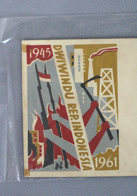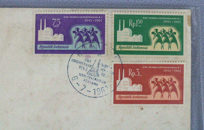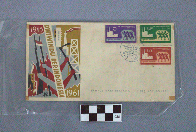 Koleksi merupakan amplok antik berbentuk persegi panjang dengan panjang 18,5 cm dan lebar 10 cm yang memiliki edisi sampul hari pertama. Pada bagian kanan amplop terdapat gambar yang menunjukkan latar belakang industri dengan kobaran api merah. Gambar tersebut turut menampilkan tangan yang mengangkat senjata, bambu runcing, dan cangkuk. Pada gambar tersebut terdapat tulisan "DWIWINDU REP. INDONESIA". Pada pojok kanan amplop, terdapat 3 prangko dengan nominal berbeda. Ketiganya memiliki deskripsi gambar yang sama (ikon pabrik dan 3 orang menggotong barang di pundak) namun kemudian dibedakan melalui nominal dan warnanya. 1. Prangko 75 sen (Berwarna Ungu) 2. Prangko Rp.1,50 (Berwarna Hijau) 3. Prangko Rp. 3 (Berwarna Merah) Ketiga prangko tersebut diberi cap yang bertuliskan "DWI WINDU KEMERDEKAAN REPUBLIK 1945 1961 HARI PENERBITAN PERTAMA". Pada bagian bawah amplop terdapat tulisan "SAMPUL HARI PERTAMA-FIRST DAY COVER". Kondisi dari koleksi tersebut terlihat baik dengan catatan terdapat beberapa noda dan warna dasar koleksi mulai menguning.