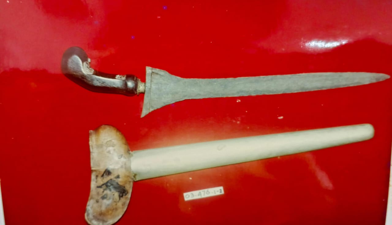 Katun warna putih bersulam benang kelengkang, kepala kain motif tumpa, suluran dan kelopak bunga, bidang kain dipenuhi motif kelopak bunga, kaki kain berles hitam.