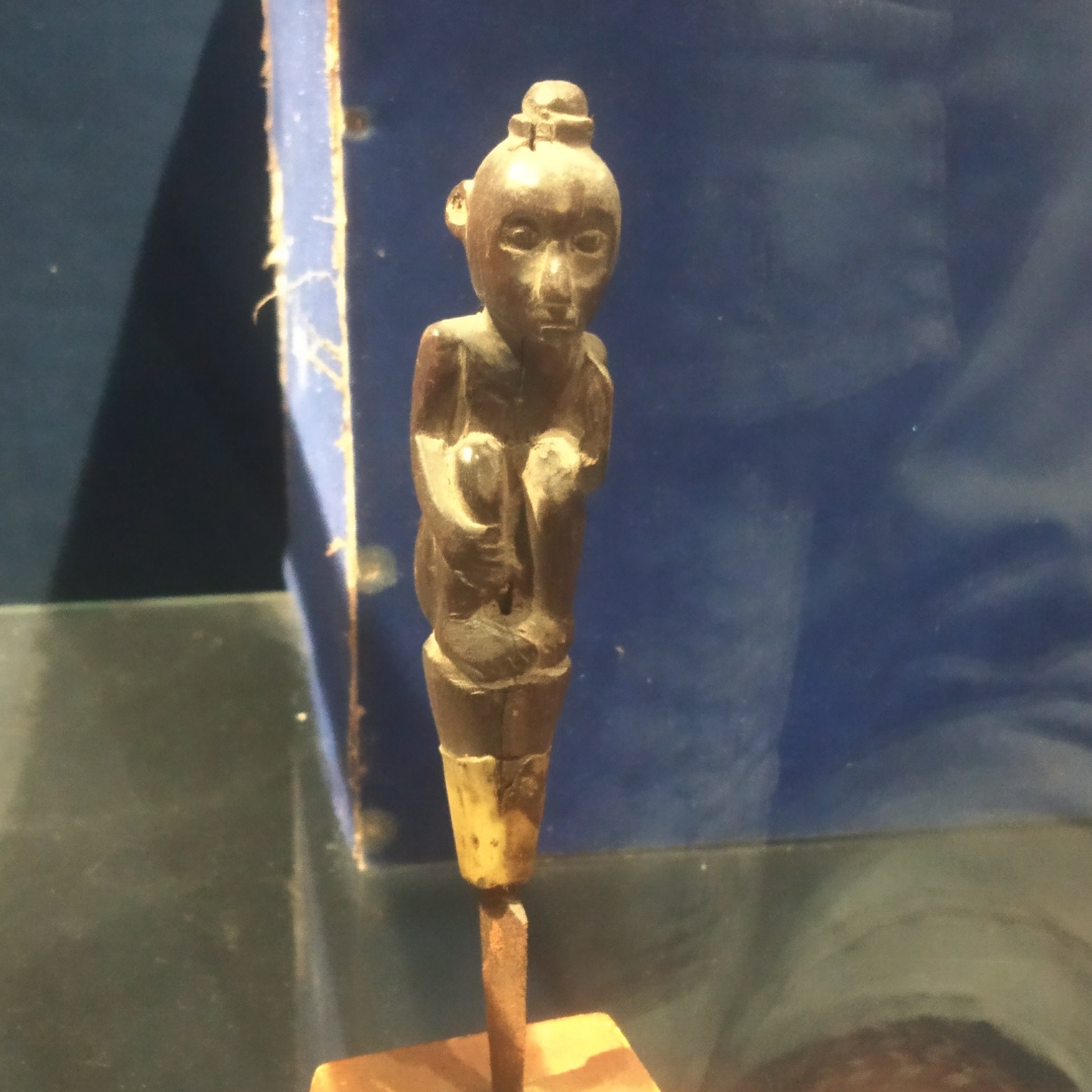Sarung parang terbuat dari kayu, warna cokelat. Dihiasi beberapa buah tali riman. Hanya tersisa sarungnya saja.
