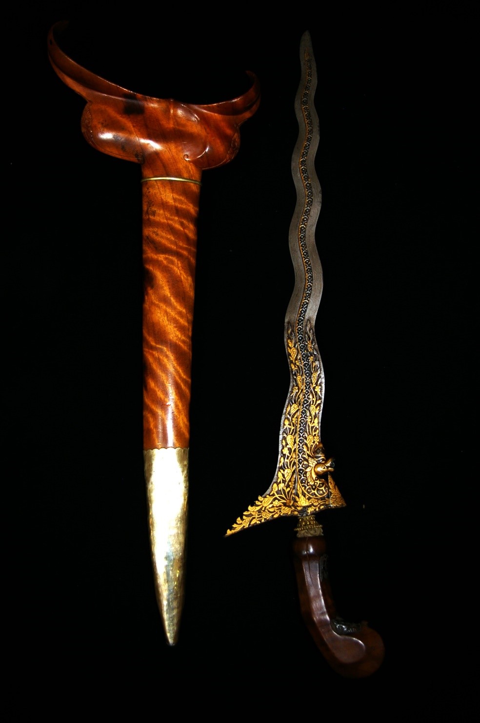 Sarung dibuat dari kayu, terdiri dari dua lapis Serat kayu tampak jelas, warna coklat. Bentuk lurus, ujung lancip.