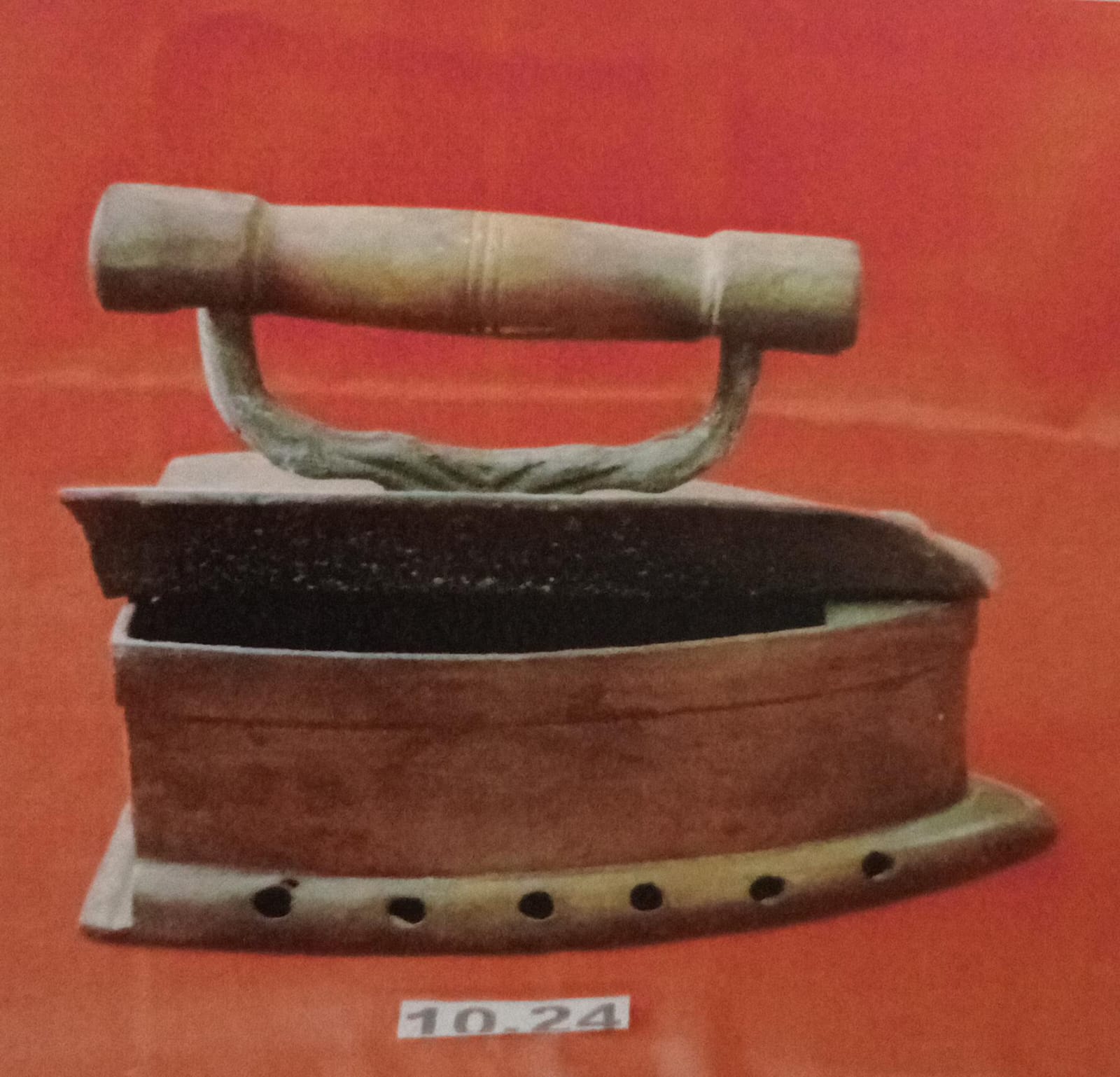 Koleksi ini terbuat dari besi, kuningan, dan kayu. Pada bagian wadah terdapat 12 lubang yang berfungsi sebagai tempat pembuangan limbah abu arang. Pada bagian dalam wadah terdapat plat besi yang berlubang sebagai tempat keluarnya limbah arang ke bawah, berfungsi sebagai alat untuk menyetrika pakaian.