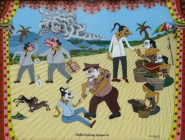 Pada lukisan berjudul "Rebut Balung Tanpa Isi" secara keseluruhan menggambarkan kondisi sosial kemasyarakatan sehari-hari. Pada lukisan ini terdapat gambaran pegunungan serta kondisi geografis pegunungan pada umumnya: terdapat pepohonan, persawahan, serta perbukitan. Gambaran aktivitas sosial pada lukisan ini menjelaskan adanya aktivitas jual beli, pertikaian yang memperebutkan sebuah tulang, dan gambaran dua orang pengusaha. Terdapat dua ekor hewan, yaitu seekor anjing dan seekor kambing. Figur yang tampak jelas pada lukisan ini menggambarkan karakter ‘Punakawan’ dalam pewayangan Jawa. Adapun ‘Punakawan’ tersebut terdiri atas Semar (yang mengenakan baju setelan jas dengan memegang karung dan kotak uang), Petruk (yang mengenakan baju kemeja putih yang juga terlihat seperti sedang bertransaksi jual beli dengan dua figur Perempuan), Gareng (yang terlihat mengenakan kemeja biru dengan posisi duduk dan memegang tulang), dan Bagong (yang mengenakan seragam layaknya polisi yang terlihat sedang merebut sebuah tulang dari Gareng). Pada lukisan ini juga terdapat dua figur tambahan seorang pria dengan setelan jas bersama dengan Semar dan terdapat seorang wanita yang sedang menjajakan dagangannya, serta memiliki bentuk fisik yang berbeda dari figur lain pada lukisan ini. Pada sisi samping dan atas lukisan ini terdapat tirai dengan varian warna merah, merah muda, kuning, hijau, dan coklat yang bermotifkan bunga berwarna keemasan. Pada bagaian samping tokoh yang sedang berdagang terdapat sebuah paying yang berwarna biru tua, biru muda, merah, merah muda, kuning, dan hijau. Payung ini diposisikan seolah berfungsi untuk melindungi pedagang dari panas matahari.