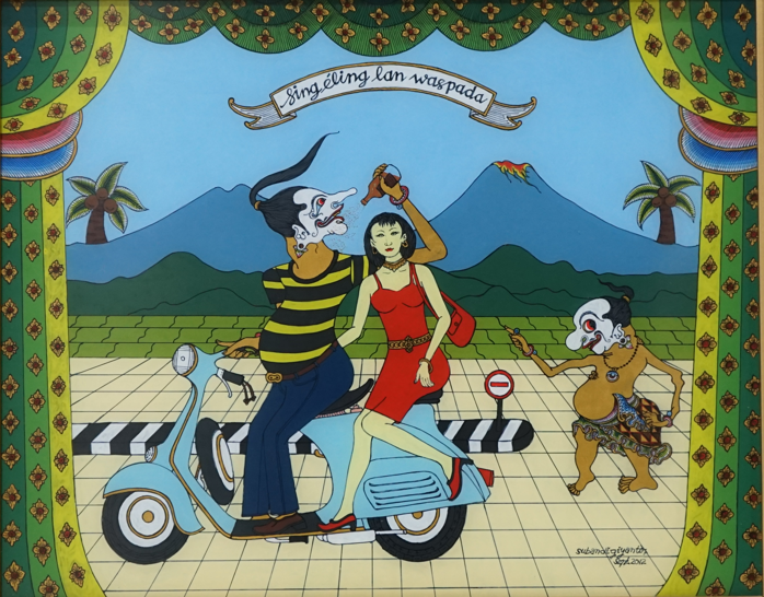 Lukisan berjudul " Sing Eling Lan Waspada" ini memiliki tema yang mengangkat tentang fenomena sosial di masyarakat, maka dari itu judul dari lukisan ini adalah “Sing Eling Lan Waspada”. Dalam lukisan ini terdapat 3 tokoh. Dua tokohnya berupa wayang. Namun, dengan pakaian yang modern dan tradisional. Wayang yang menggunakan pakaian modern dengan motif garis-garis berwarna hitam, kuning, lalu memakai ikat pinggang berwarna coklat, celana jeans berwarna biru tua, sepatu berwarna coklat, dan gelang berwarna merah muda sambil memegang sebuah botol minuman yang bernama Petruk. Wayang tersebut memiliki warna badan kuning keemasan, sedangkan wajahnya sesuai dengan bentuk wayang Petruk. Posisi wayang Petruk ini sedang duduk di atas motor vespa berwarna biru muda dengan sedikit tambahan warna kuning keemasan. Atribut motor vespa pada lukisan ini digambarkan secara lengkap. Karakter kedua dalam lukisan ini adalah nona-nona berkulit kuning langsat dengan mengenakan gaun selutut berwarna merah merona. Karakter ini terlihat mengenakan sepatu dan tas berwarna merah, mengenakan gelang, anting, sabuk, dan kalung berwarna emas. Karakter ini tampilannya terlihat seperti manusia pada umumnya dengan memiliki rambut yang berwarna hitam, dan menggunakan lipstik berwarna merah. Posisi duduknya menyamping ke kiri dengan tangan kanan terlihat sedang memegang pinggul si tokoh Petruk. Karakter ketiga adalah Gareng. Karakter ini mengenakan kain yang dililit di bagian pinggul, ia terlihat mengenakan pakaian tradisional. Tokoh ini mengenakan cincin, kalung, dan gelang yang berwarna biru dan merah. Kulitnya berwarna kuning keemasan layaknya kulit dari tokoh Petruk. Kaki kanannya terlihat lebih panjang jika dibandingkan dengan kaki kirinya. Tangan sebelah kirinya terlihat cacat jika dibandingkan dengan tangan sebelah kanannya. Pada jari telunjuk tangan sebelah kanannya terlihat sedang menunjuk ke arah Petruk dan nona seolah sedang memberi peringatan untuk selalu berhati-hati dalam bertindak. Pada bagian kanan, kiri, dan atas lukisan terdapat tirai yang bergelomobang serta terurai menjuntai ke bawah. Motif pada tirai tersebut adalah motif bunga dengan warna kuning keemasan dan merah. Pada bagian tirai lainnya terdapat warna hijau tua, hijau muda, kuning, merah muda, merah, putih, biru muda, dan biru muda. Pada bagian latar lukisan terdapat gambar langit dengan warna biru muda, terdapat dua gambar berbentuk gunung berwarna biru tua yang salah satunya terlihat seperti gunung aktif, karena terlihat adanya lahar pada gunung tersebut, terdapat 2 pohon kelapa di kanan dan kiri. Masing-masing pohon memiliki 3 buah kelapa dan dengan daun kelapa berwarna layaknya pohon kelapa pada umumnya. Di bawah gunung terdapat gambar berbentuk bukit berwarna hijau tua, di bawah bukit terdapat sawah berwarna hijau muda, lalu juga terdapat jalan berwarna krem dengan pola kotak-kotak dengan terdapat pembatas jalan berwarna hitam putih pada bagian tengahnya dan terdapat marka jalan. Pada bagian atas lukisan terdapat tulisan “Sing Eling Lan Waspada”.