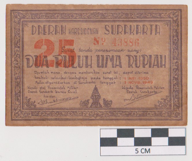 Warna coklat ada lis pinggir motif sulur-suluran. bg tengah bawah ada gambar candi diapit makara. Tulisan: DAERAH KARESIDENAN SURAKARTA, surat tanda penerimaan uang: dua puluh lima rupiah; djumlah mana, dengan memberikan surat ini dapat diterima kembali selambat-lambatnya pada tanggal : 1 Mei 1950. Mulai diperedarkan di Surakarta tanggal 1 Novb 1949. Di sisi kiri ada tanda tangan Kepala Staf Pemerintah Militer Daerah Surakarta Urusan Civiel dan di sebelah kanan tanda tangan dari Kepala Pemerintah Militer Daerah Surakarta, di stempel warna merah dengan tulisan 25 dan no seri 43720. Kondisi: baik.