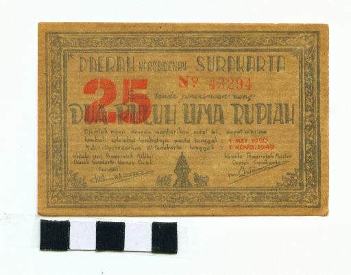 Warna coklat ada lis pinggir motif sulur-suluran. bg tengah bawah ada gambar candi diapit makara. Tulisan: DAERAH KARESIDENAN SURAKARTA, surat tanda penerimaan uang: dua puluh lima rupiah; djumlah mana, dengan memberikan surat ini dapat diterima kembali selambat-lambatnya pada tanggal : 1 Mei 1950. Mulai diperedarkan di Surakarta tanggal 1 Novb 1949. Di sisi kiri ada tanda tangan Kepala Staf Pemerintah Militer Daerah Surakarta Urusan Civiel dan di sebelah kanan tanda tangan dari Kepala Pemerintah Militer Daerah Surakarta, di stempel warna merah dengan tulisan 25 dan no seri 43725. Kondisi: baik.