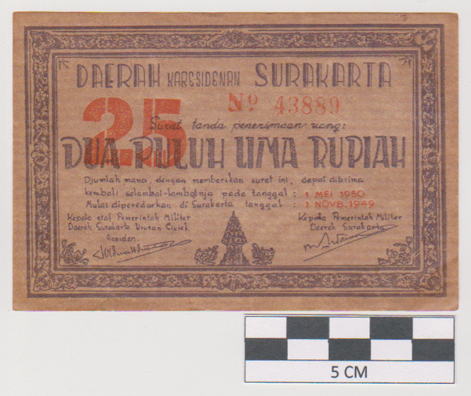 Warna coklat, ada list pinggir motif sulur-suluran, bagian tengah bawah ada gambar candi diapit makara. Tulisan DAERAH KARESIDENAN SURAKARTA, surat tanda penerimaan uang: dua puluh lima rupiah; djumlah mana, dengan memberikan surat ini dapat diterima kembali selambat-lambatnya pada tanggal: 1 Mei 1950. Mulai diperedarkan di Surakarta tanggal 1 Nov. 1949. Di sisi kiri ada tanda tangan Kepala Staf Pemerintah Militer Daerah Surakarta Urusan Civiel, dan di sebelah kanan tanda tangan dari Kepala Pemerintah Militer Daerah Surakarta. Distempel warna merah dengan tulisan 25 dan no seri 53924 Kondisi: baik