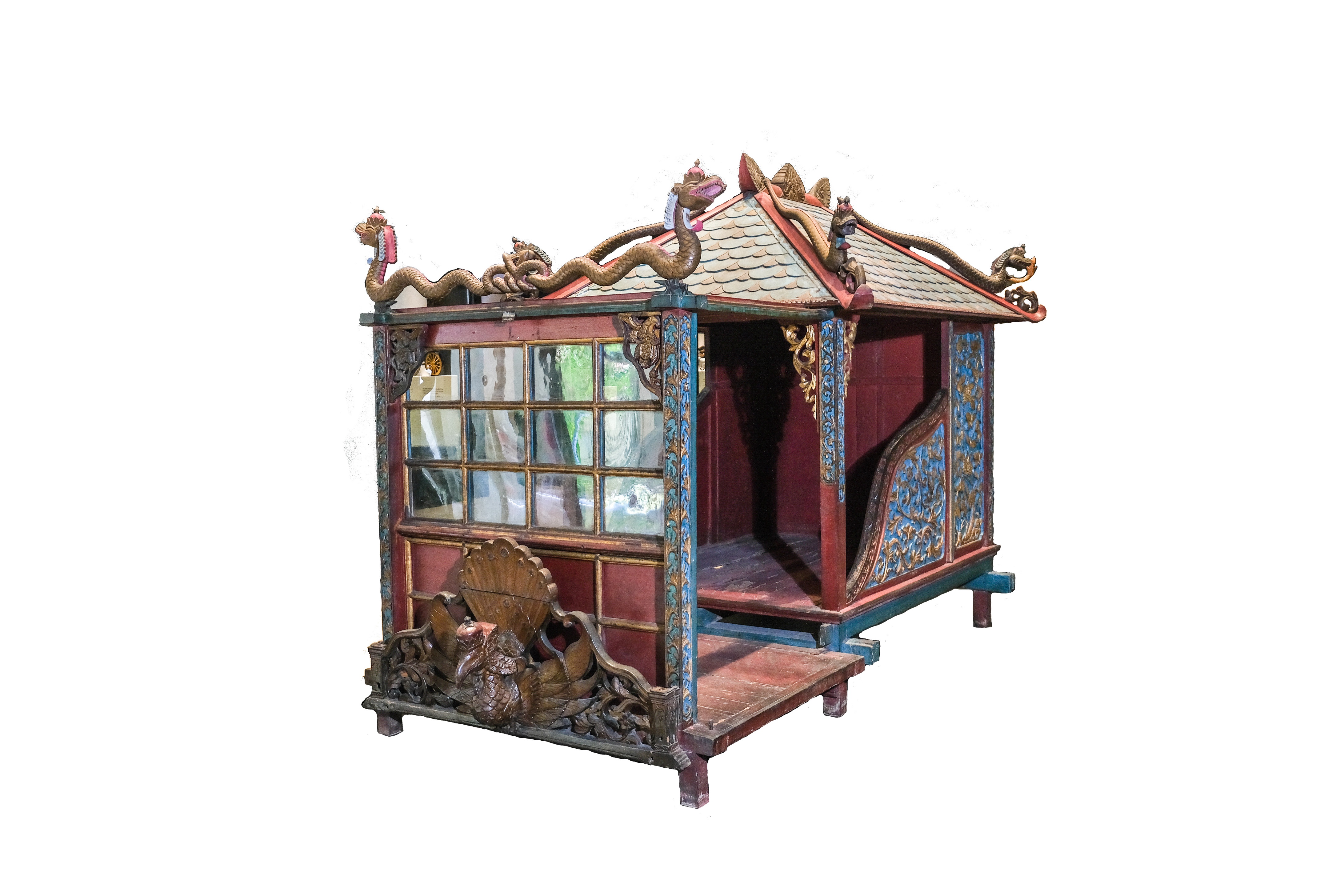 Miniatur tandu berukir terdiri dari dua bagian, bagian depan yang lebih rendah tempat kaki, belakang untuk duduk. Bagian depan beratap kaca, bagian belakang atapnya berbentuk rumah masing-masing sudut atap berbentuk ular. Tiang dan dinding berukir. Warna merah, hijau, kuning emas. Fungsi : sebagai alat angkut.