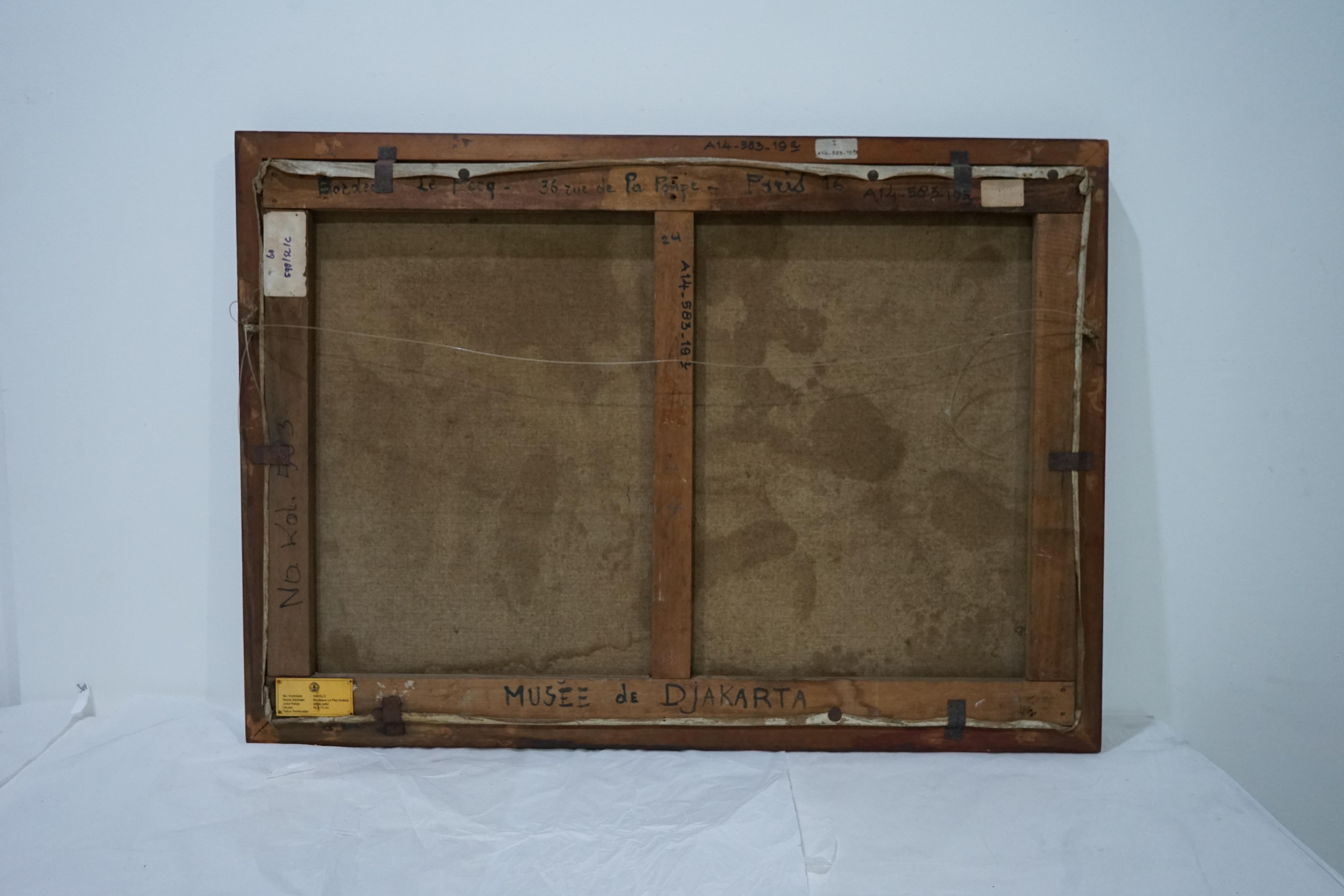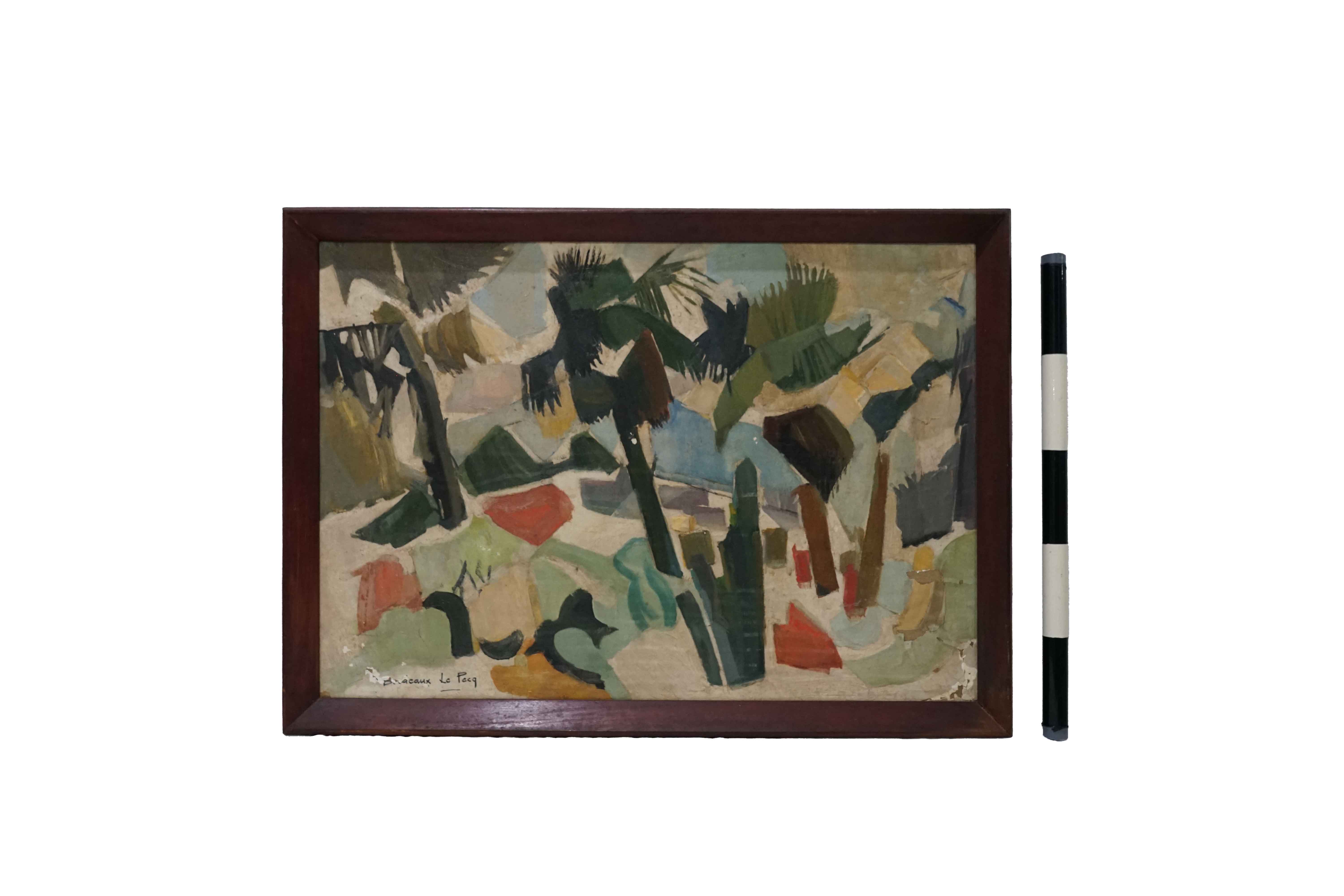 Bordeaux Le Peq Andree Tanpa Judul Cat Minyak diatas kanvas dengan bingkai 73 cm x 50 cm - Deskripsi : Lukisan ini berbentuk persegi panjang dengan bingkai kayu. Gaya yang digunakan pada lukisan ini adalah impresionisme. Lukisan ini menggambarkan pepohonan palem. Nada warna pada lukisan ini cenderung tidak cerah. Pada bagian kiri bawah terdapat tanda tangan pelukis yang tertulis “Bordeaux Le Pecq”. Pada lukisan bagian belakang atas terdapat tulisan “36 zue de Pa Pompe-Paris 16" dan di bawahnya terdapat tulisan “Musée de Djakarta”. Biodata Seniman : Andree Bordeux Le Pecq merupakan seorang seniman Perancis yang lahir pada tahun 1910. Ia kemudian mengikuti berbagai pameran, dan memperoleh penghargaan pertamanya sebagai pelukis, pengukir dan pembuat karton. Karir seninya semakin menonjol dan berbagai pameran, baik di Paris maupun di luar negeri. Ia bahkan dikenal sebagai " seorang seniman yang halus dan sensitif, meskipun jantan melalui kekuatan ekspresi " berkat karya-karyanya. Dia juga turut berpartisipasi di Salon des artistes français , Salon d'Automne dan salon Nika-Kaï di Jepang. Sepanjang karirnya, terdapat tiga periode dalam produksi karyanya: periode realistik, periode kubisme, dan periode colorist.