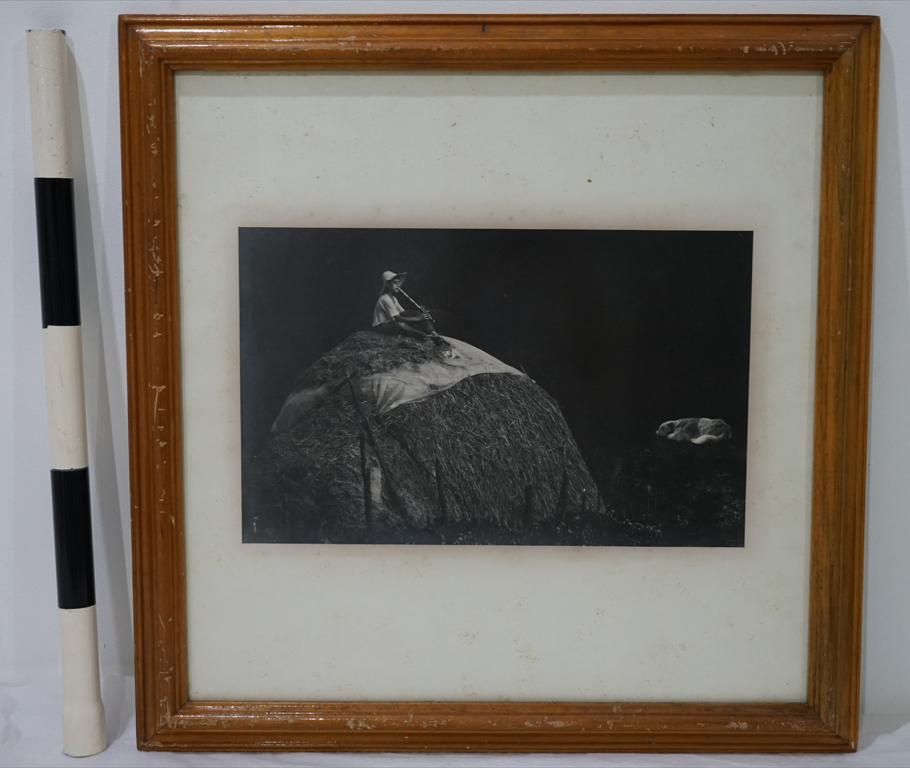 "Tanpa Judul/Untitled Anonim Seni Fotografi 6/SF/A 35,5 X 22 cm Karya fotografi ini merupakan karya fotografi “human interest” yang menggambarkan tampilan seorang anak desa yang berjenis kelamin laki-laki yang terlihat sedang duduk di atas tumpukan jerami sambil memainkan sebuah seruling. Atribut yang dikenakan oleh anak lelaki ini adalah topi caping, kaos berwarna putih, celana panjang dan sendal jepit. Lelaki ini duduk menghadap ke samping kiri. Di samping tumpukan jerami yang tinggi dimana seorang laki-laki duduk tersebut, terdapat tumpukan jerami yang lebih rendah. Pada bagian atasnya terlihat seekor anjing yang sedang tidur menghadap ke sebelah kanan. Teknik yang digunakan dalam foto ini adalah “candid”, foto ini berjenis lukisan landscape atau horizontal. Secara keseluruhan foto ini berwarna hitam dan putih. Pada warna jerami terlihat terdapat perbedaan warna antara jerami yang tinggi dengan jerami yang lebih rendah. Jerami yang tinggi memiliki tekstur yang lebih terlihat dibandingkan dengan jerami yang lebih rendah karena adanya perbedaan pencahayaan. Jerami yang lebih tinggi terlihat lebih terang. Pada bagian depan jerami terdapat beberapa kayu yang menancap. Foto ini memiliki frame yang terbuat dari kayu berwarna coklat. "