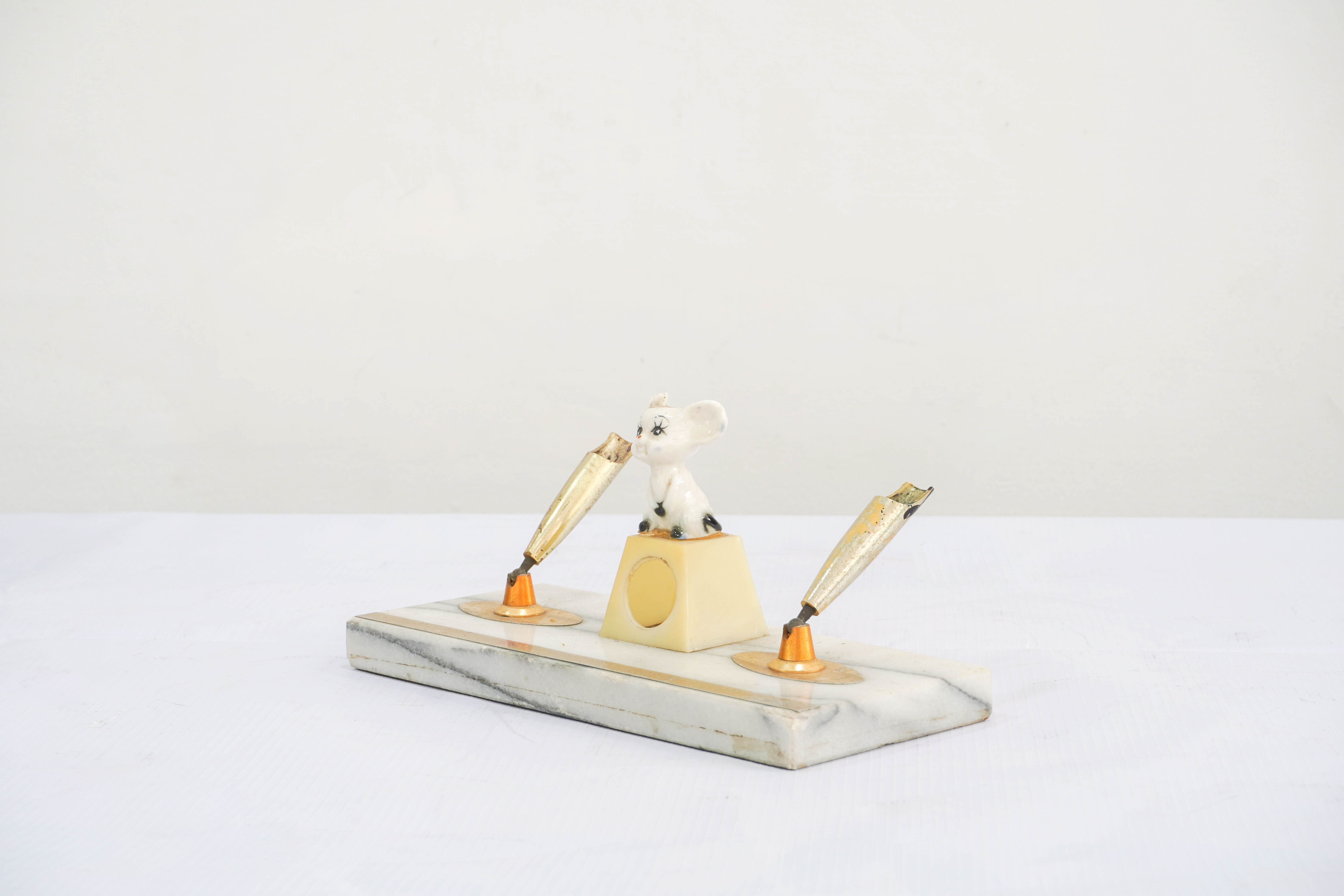 Koleksi ini berupa tatakan pulpen berbahan dasar marmer berwarna putih dengan guratan abu-abu alami. Bentuknya persegi panjang pipih dengan permukaan halus. Di bagian atas terdapat dua dudukan pulpen berbahan logam berwarna emas yang dipasang simetris di sisi kiri dan kanan, dengan permukaan yang sudah menunjukkan goresan dan kelupas. Pada bagian tengah terdapat ornamen berbentuk segitiga kecil berwarna krem yang di atasnya ditempatkan figur hewan putih mungil dengan telinga besar. Kombinasi material marmer, logam, dan keramik kecil memberikan kesan dekoratif sekaligus fungsional. Kondisi koleksi masih utuh meskipun terdapat bekas pemakaian pada dudukan logam.