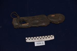 Berbentuk sempit lonjong, leher panjang, bibir tebal dan membalik keluar, terbuat dari tanah liat yang diglasir warna coklat muda hiasan tekan yang dibentuk dalam cetakan berwarna biru,hijau,putih,krem, dan mengkilat. pada pundak ada delapan buah telinga vertikal beralur berujung bekas tekanan jempol. Diatas ban berhias motif swastika. Pada ban bergantungan delapan daun semangi berbatang pendek diantara delapan telinga. Sebelah atas badan ada empat ekor burung bangau silih berganti dengan empat ekor singa horizontal bercakar tiga dengan kepala menghadap ke atas delapan roset bunga. Bagian dasar bawah rata tanpa glasir warna coklat.