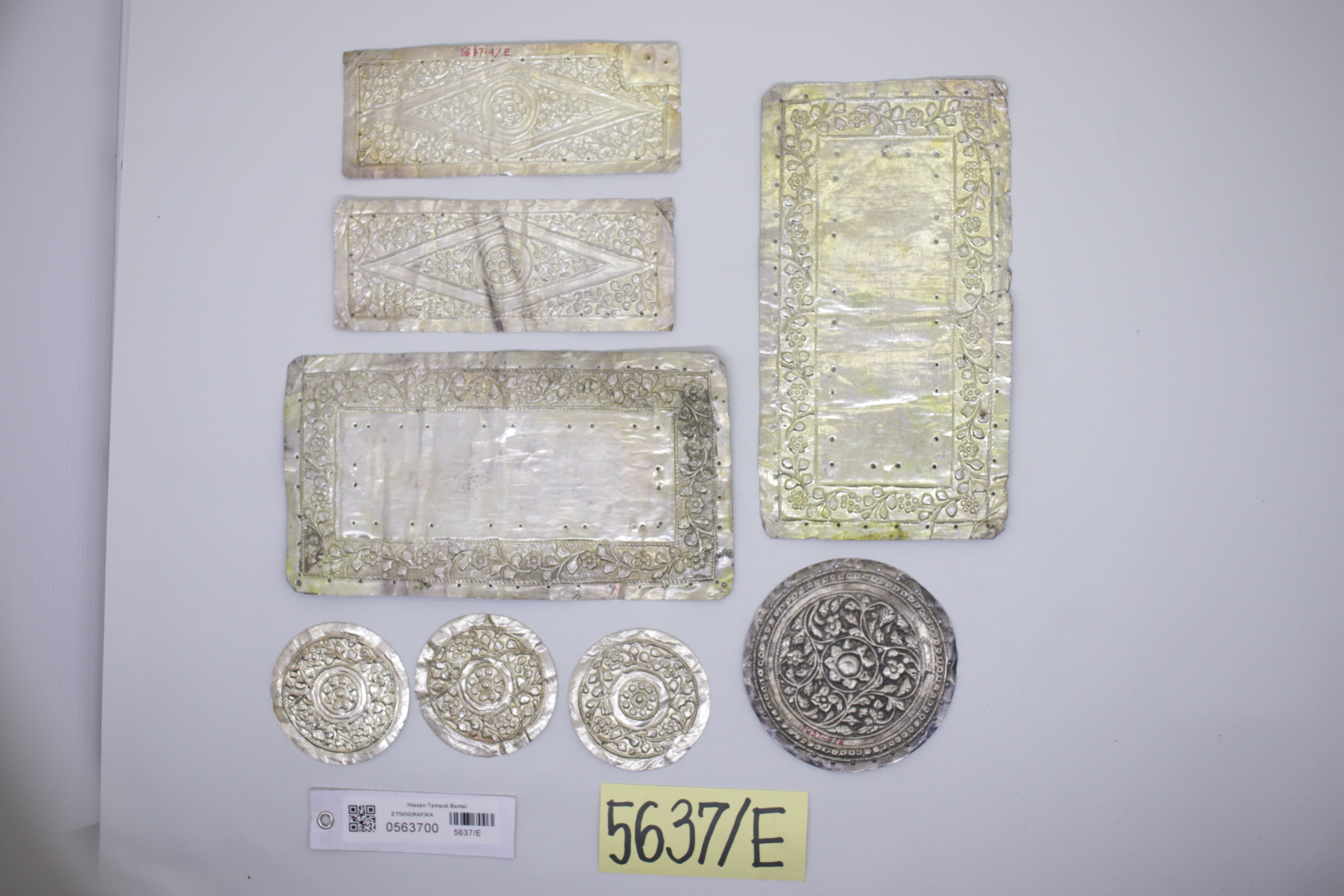 Benda ini terbuat dari bahan dasar kayu, berwarna coklat, berbentuk persegi panjang pada kedua sisi bermotif naga melilit pada sulur, berfungsi untuk menem -patkan senjata keris, -dan tombak.