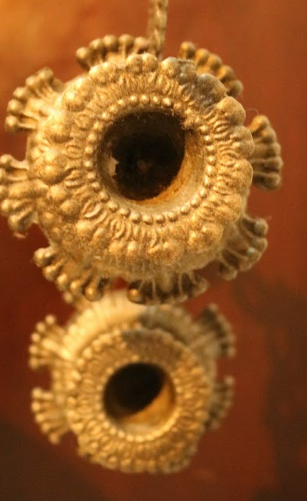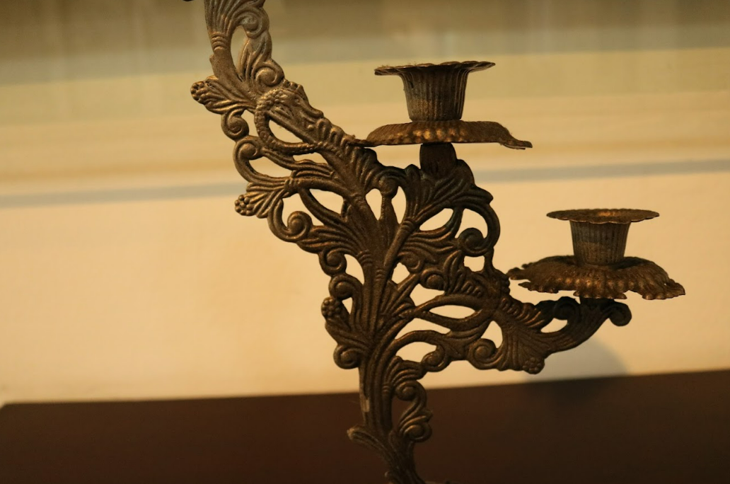 Tempat lilin berwarna silver keabu-abuan. Berbahan tembaga. Memiliki 3 tempat untuk menaruh lilin dengan bentuk kelopak bunga. Bentuk keseluruhan tempat lilin menyerupai rangkaian bunga. Bagian dasar memiliki motif ukiran floral.