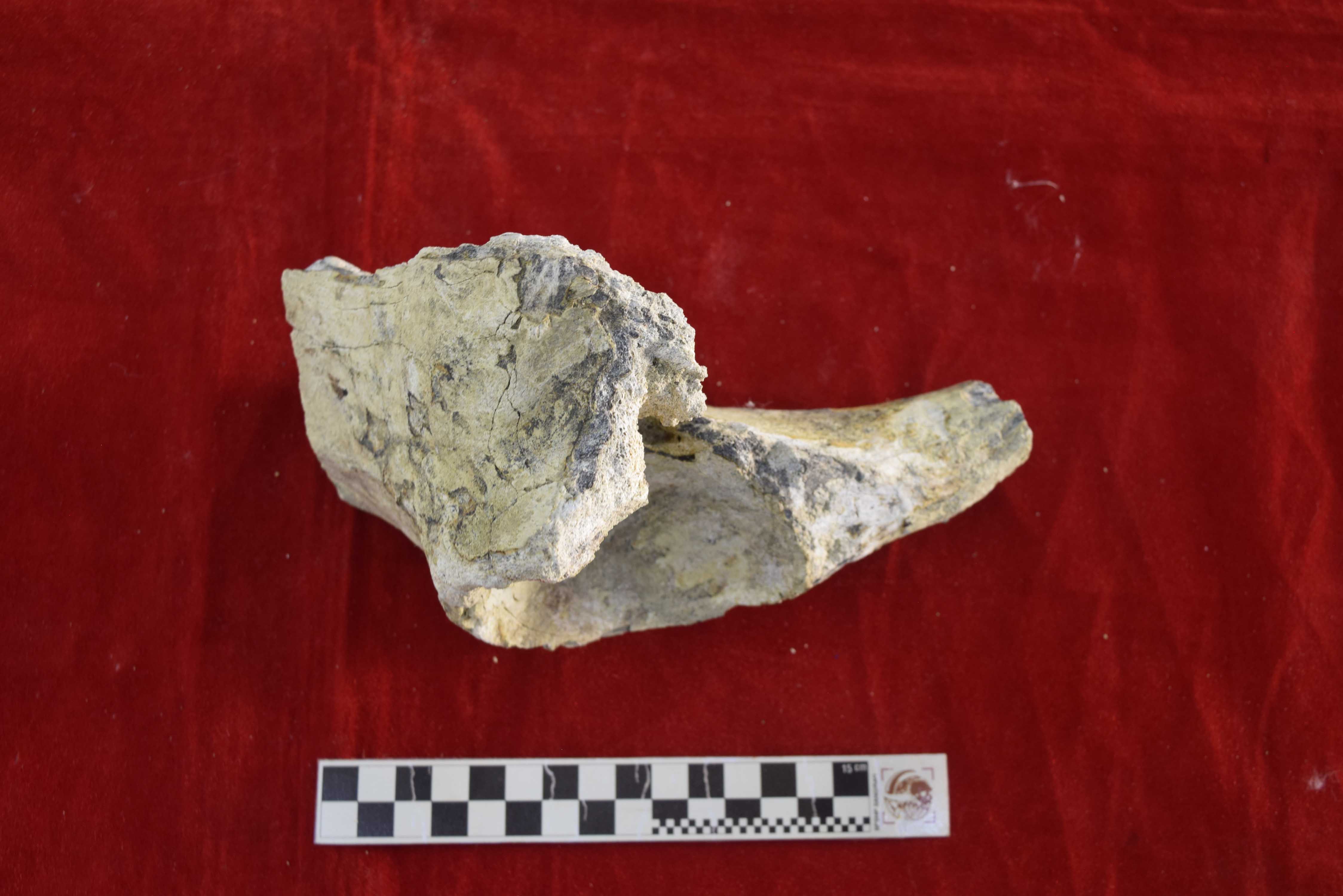 Terbuat dari batuan bentuk bulat warna coklat mengkilat, mulut besar dan bibir tebal, bertelinga enam vertikal, motif relief cetak dan gores dua pasang naga dan dua bola api. Bagian bawah besar, dasar agak cekung tanpa glasir warna kecoklatan.