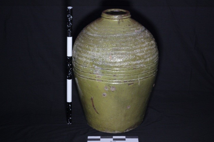Tempayan ini pada awalnya merupakan milik masyarakat secara perorangan atas nama Bapak Salim yang beralamat di Perum Prima Indah Kedungjajang, dan kemudian dihibahkan kepada Museum Daerah Lumajang pada tahun 2016. Tempayan berbentuk silinder dengan bagian bahu membulat dan semakin ke bawah semakin mengecil. Warnanya hijau kekuningan. Abshu tempayan berukuran lebih lebar daripada bagian dasar, sedangkan bagian dasar lebih besar daripada bagian bibir tempayan. Bagian bawah tidak memiliki pola hias atau polos, sedangkan bagian tengah terdapat empat motif hias berupa empat goresan bentuk garis melingkar yang bersusun ke atas dan dilanjutkan dengan pola hias goresan berupa garis kecil-kecil vertikal pada semua permukaan bahu hingga bibir. Bibir tempayan berbentuk melengkung keluar.