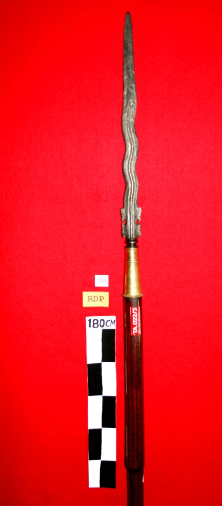 Terbuat dari bahan batuan, langsing tinggi warna coklat, tepi mulut tebal membalik keluar. Hiasan motif relief tekan di tepi mulut terdapat motif pinggiran awan berderet. Bagian pundak terdapat 8 buah telinga vertikal beralur, berujung bekas tekanan jempol yang dihubungkan oleh garis yang digores, di bawahnya terdapat motif naga horizontal. Badan bawah terdapat motif awan dan rangkaian bunga, lidah api. Dasar bawah cekung tanpa glasir.