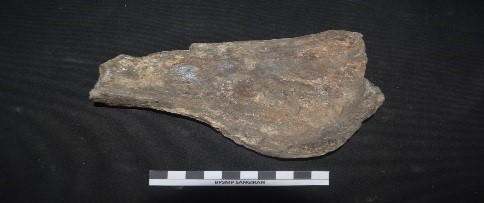 Bentuk bulat tinggi, berleher dengan bibir membalik keluar diberi glasir, terbuat dari bahan batuan. Hiasan gores dan relief tekan, glasir coklat mengkilat meleleh hingga badan bagian bawah. Pada pundak terdapat enam bunga telinga vertikal berbentuk topeng raksasa. Badan dengan dua naga kawok besar berhadapan, horizontal. Dari pundak hingga kebadan bawah yang tidak berglasir dengan waled coklat. Dasar cekung tanpa glasir dan berpasir-pasir.
