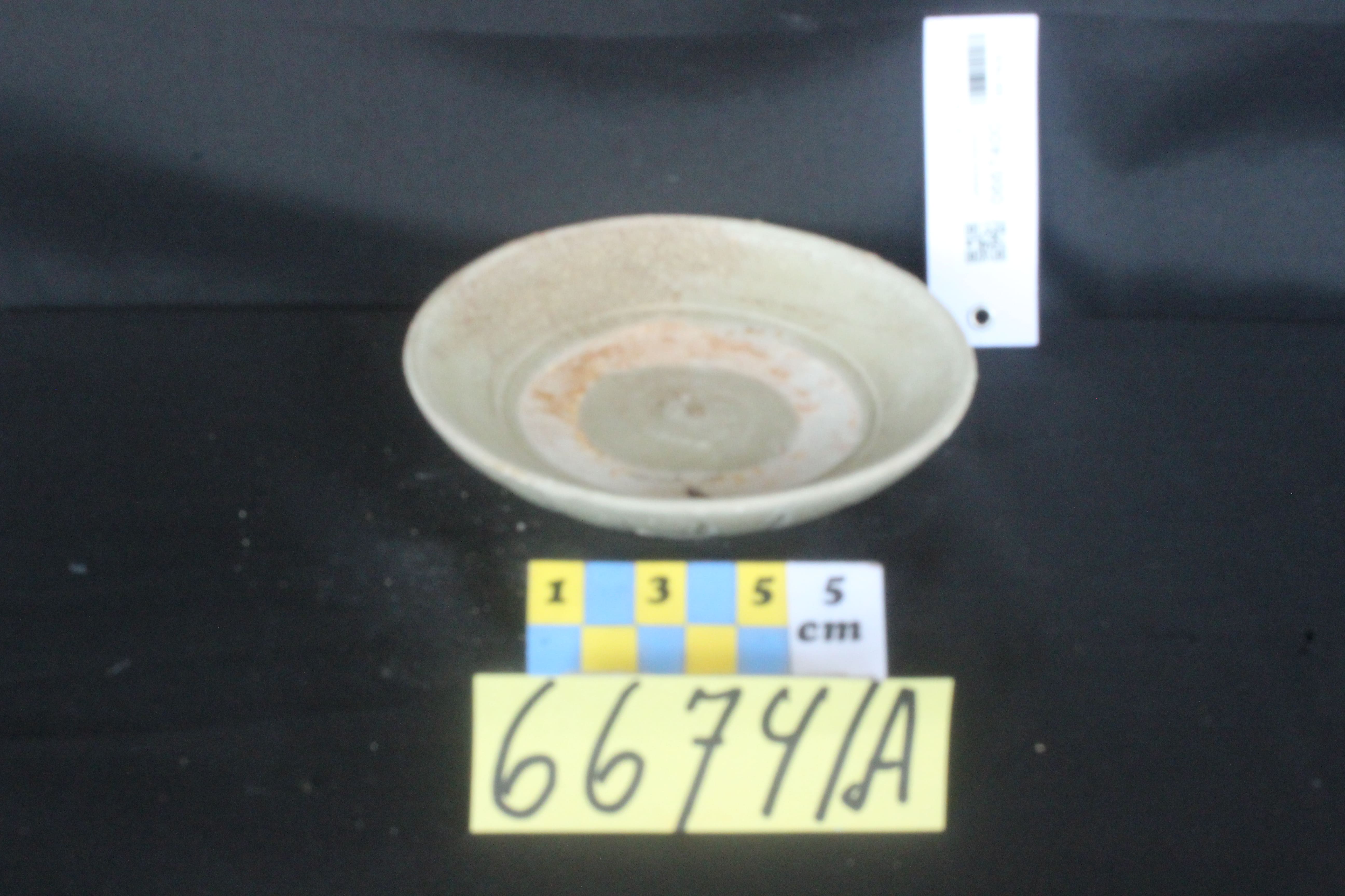 Berbentuk bulat, berleher, dengan bibir tebal, terbuat dari tanah liat. Pada puncak terdapat tiga buah vertikal berbentuk melengkung lebar dan bergaris-garis yang digores, tiga buah ban timbul melingkari pundak sedangkan diantara ban dihiasi dengan motif garis-garis gelombang dan di bawah ban-ban juga dihiasi dengan garis-garis lurus dan garis-garis gelombang melingkari pundak dengan digores.