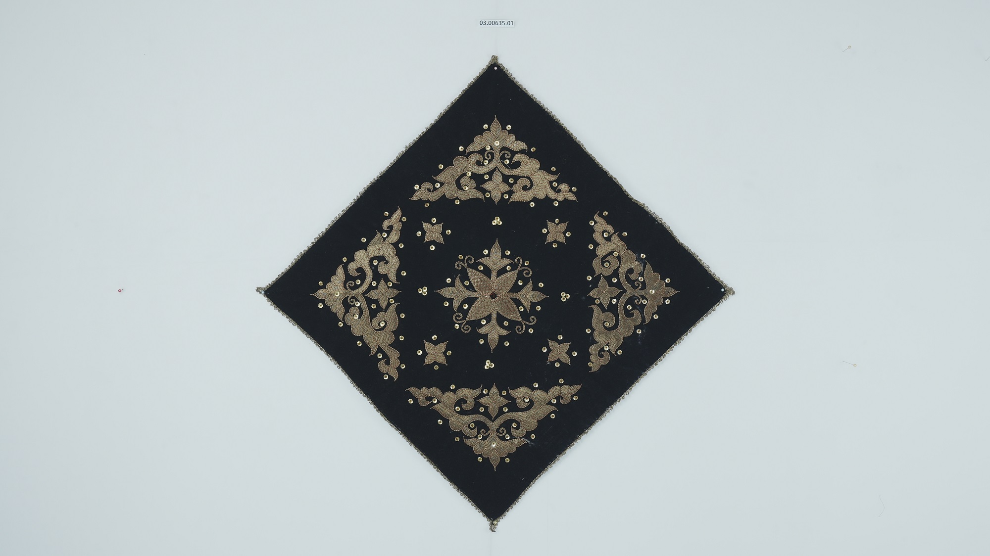 dua buah tikar duduk terbuat dari beludru,warna hitam dengan ksab emas, motif bunga sudut,bunga seuleupok serta di taburi ablak dan manik-manik. digunakan untuk perlengkapan pelaminan aceh berat